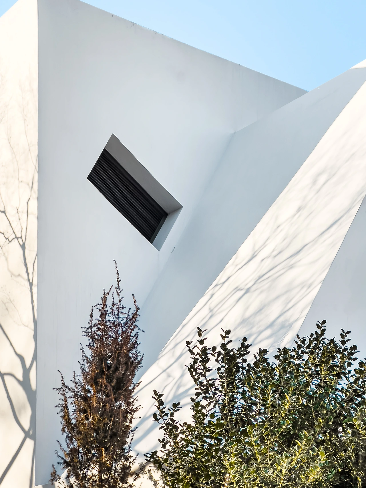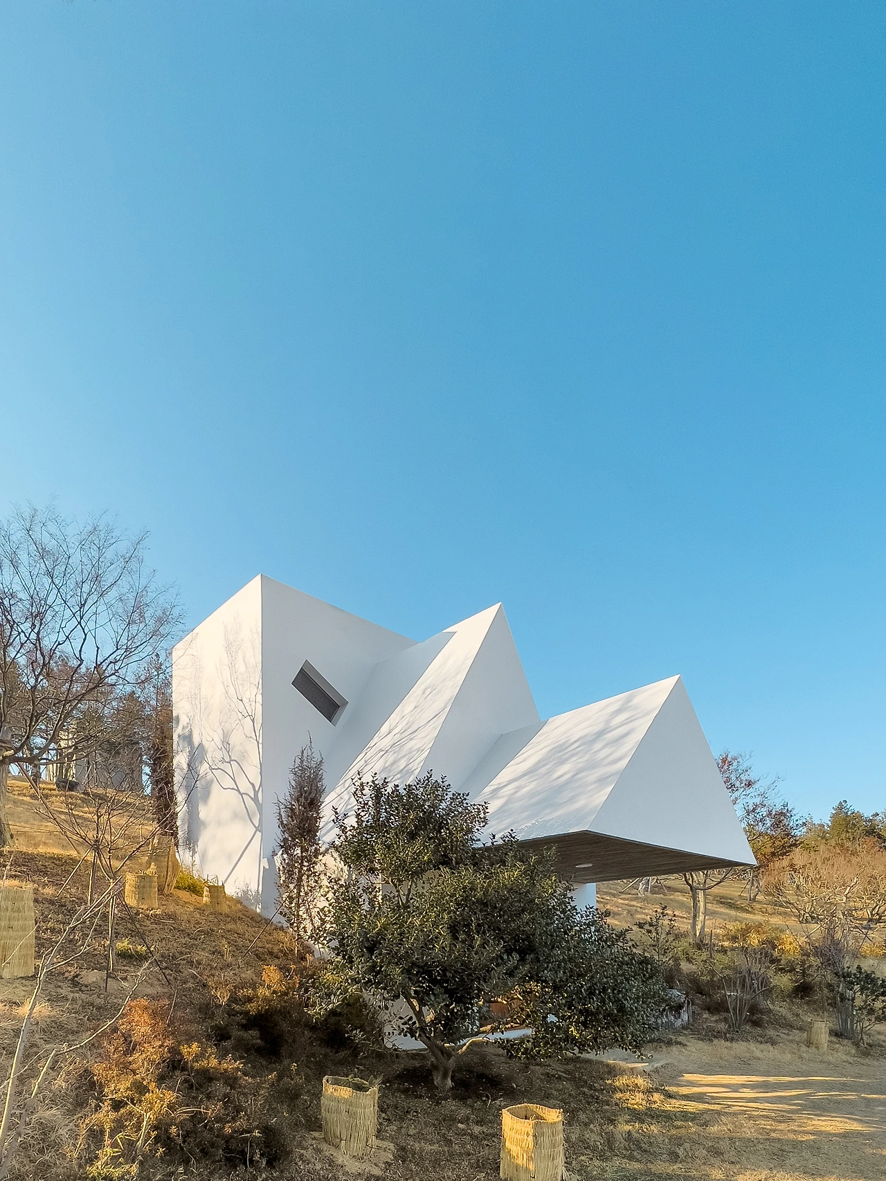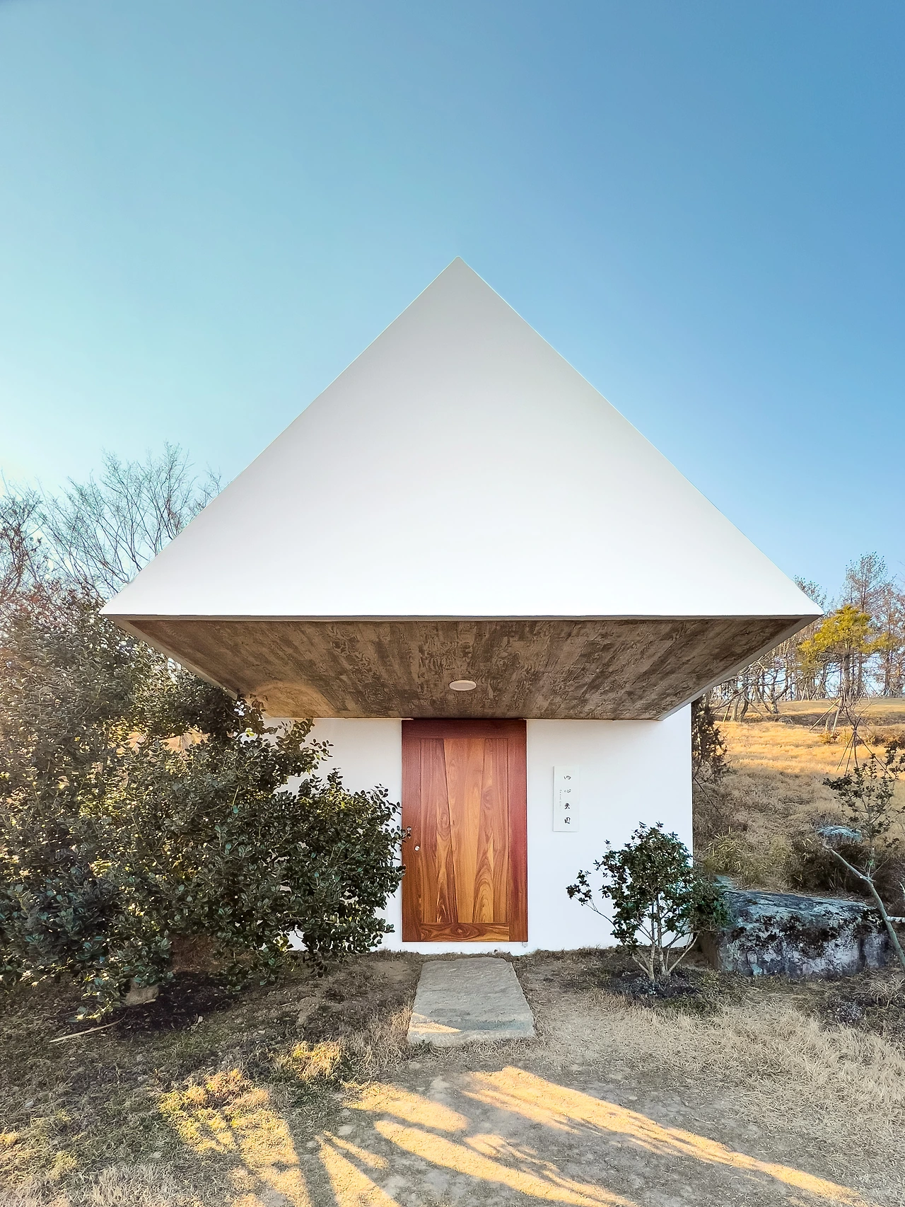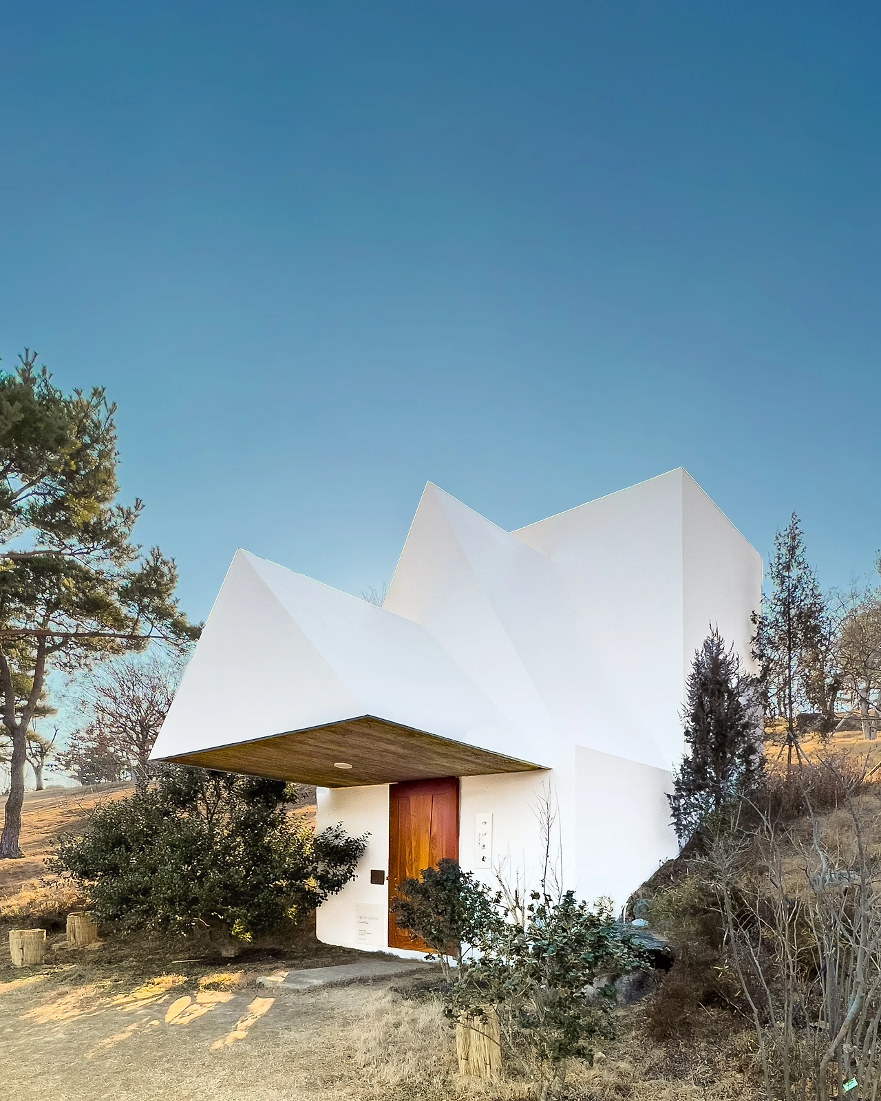 마음의 평화를 찾는 방법은 건물의 위태로운 외관에서 시작한다. 삼각형의 내민 보(캔틸레버 구조)는 두껍고 무겁게 보이고 날카로워 긴장감을 준다. 안으로 들어가는 문은 미닫이문인 것처럼 위장했지만, 알고 보면 여닫이문이기에 불안한 내민 보 아래에서 문을 열려고 시도하면 열리지 않아 당황한다. 끝내 문을 열고 들어가면 고꾸라질 것 같았던 외관과 달리, 안정적으로 구성된 공간과 가구, 밖과 대비되는 암흑의 공간이 마음을 편안하게 한다. 어둠은 나를 감추고 빛은 먹잇감을 노출하기 때문에, 상대적으로 어두운 공간이 안전한 공간으로 인식되는 것이다.