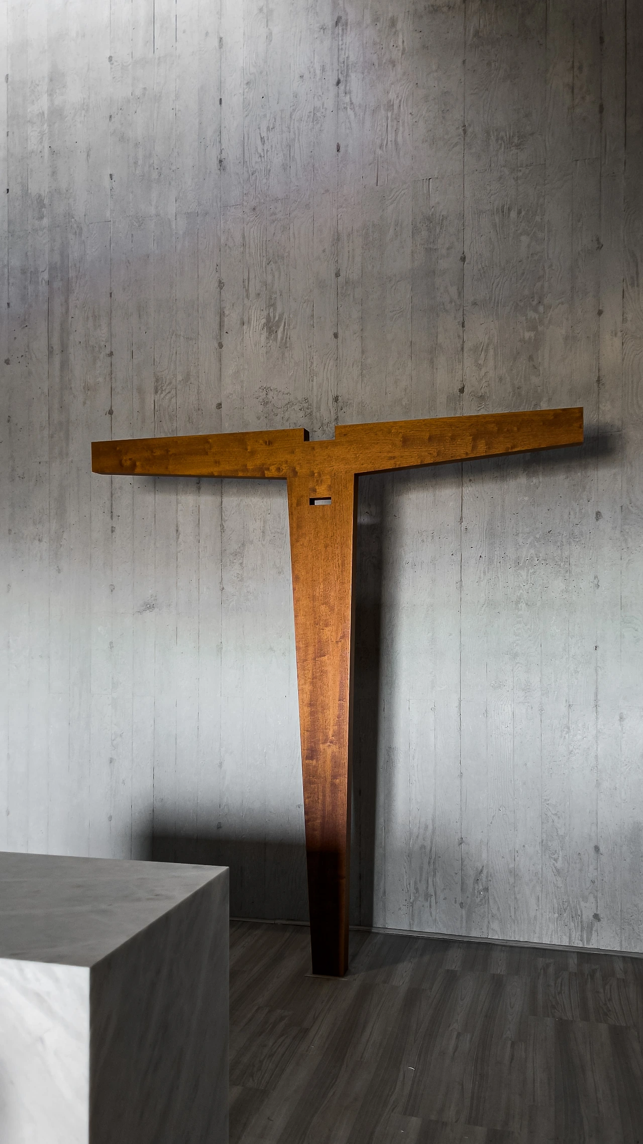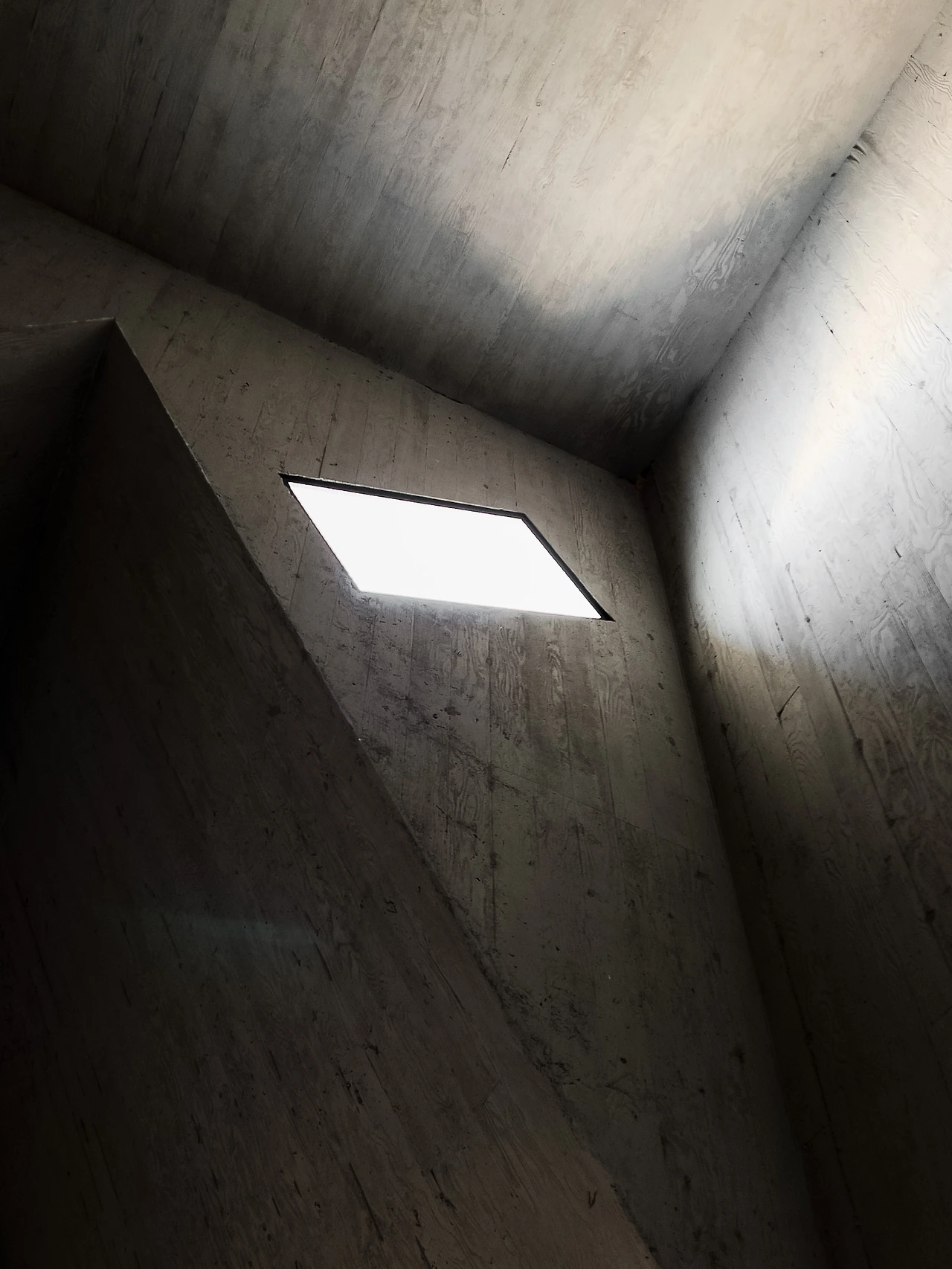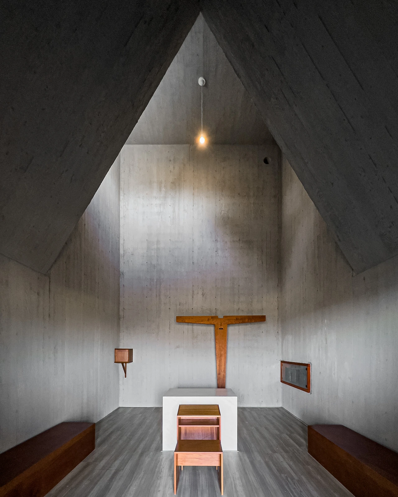 내부를 밝게 비추는 빛은 상단 벽에 비스듬히 뚫린 작은 창이 전부지만, 공간이 작아 그것만으로도 충분하다. 작은 창으로 들어온 빛은 비스듬하게 배치되어 내부의 대칭을 깨는 십자가를 비추며, 이곳이 작은 경당임을 깨닫게 한다. 혼자서 두꺼운 나무문을 닫고 작은 창이 십자가를 비추고 있을 때, 우리는 그곳에서 기도하며 내면에 집중하고 '마음속 낙원'을 찾게 되는 것이다.