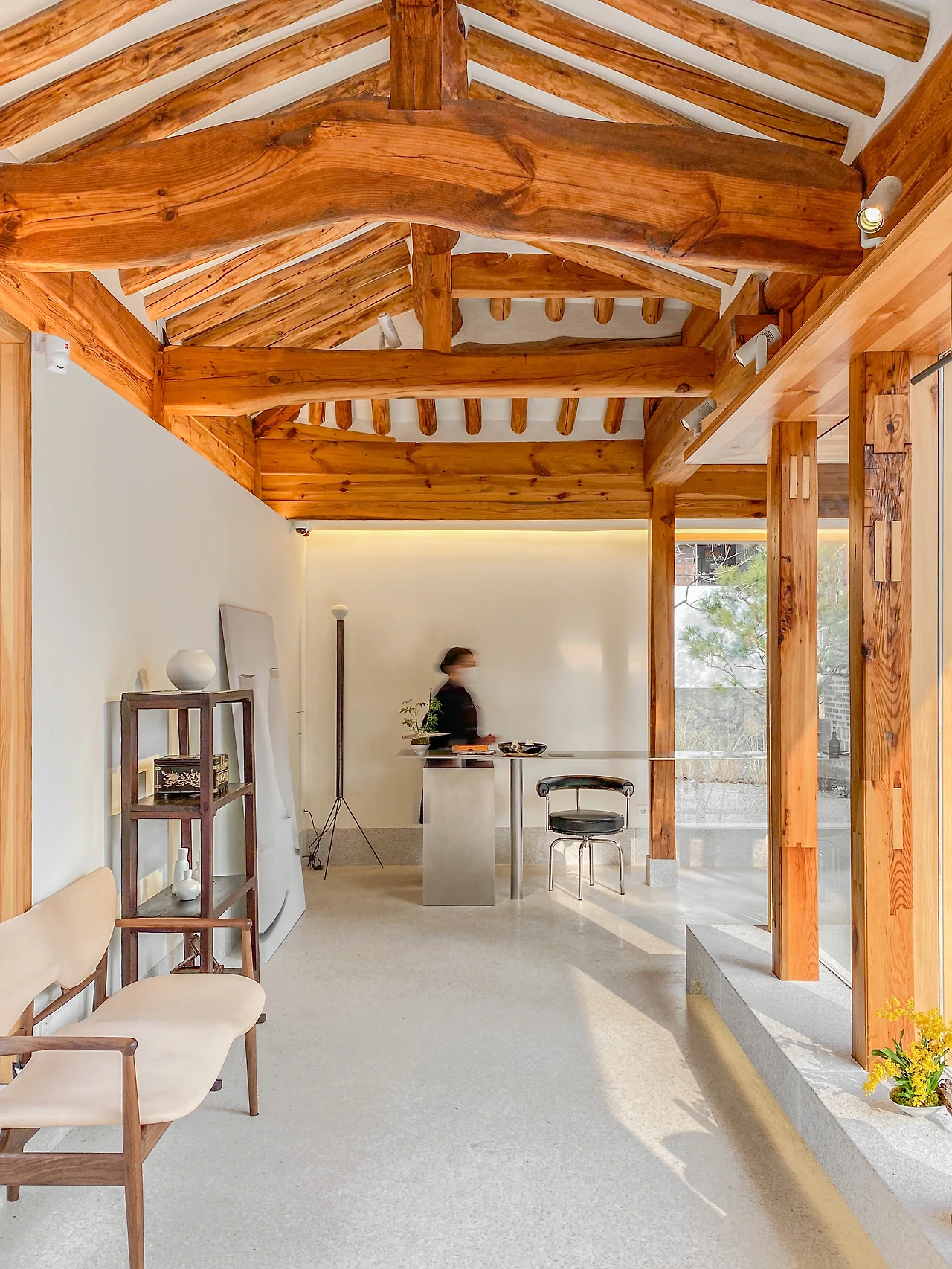 1960년대 지어진 양옥과 30년대 지어진 한옥이 만나 만들어낸 서로 다른 시대와 양식의 공존은 그야말로 흥미롭다. 하지만, 단차가 많이 나는 두 공간을 함께 경험해야 하는 사용자로서는 좋은 상태는 아니다. 위계가 있고, 높은 단위에 있는 공간을 많은 계단을 타고 오르내리는 수고로움이 있기 때문이다. 다행히 한옥과 양옥 사이에 새로 중축된 백색 건물이 두 공간을 완충시켜주고 서로 이어주기까지 하니, 내부의 경험을 더 탄탄하게 한다.