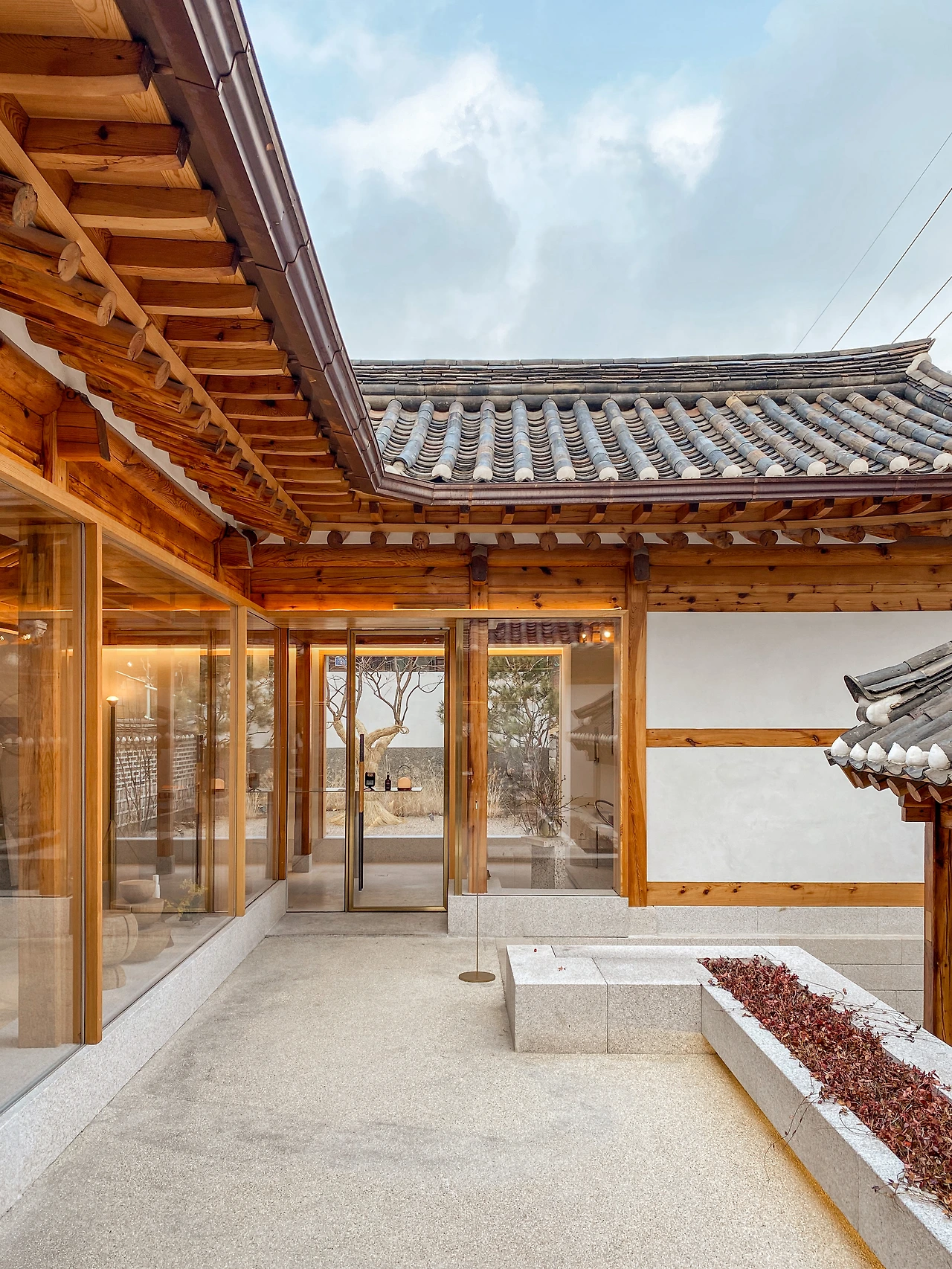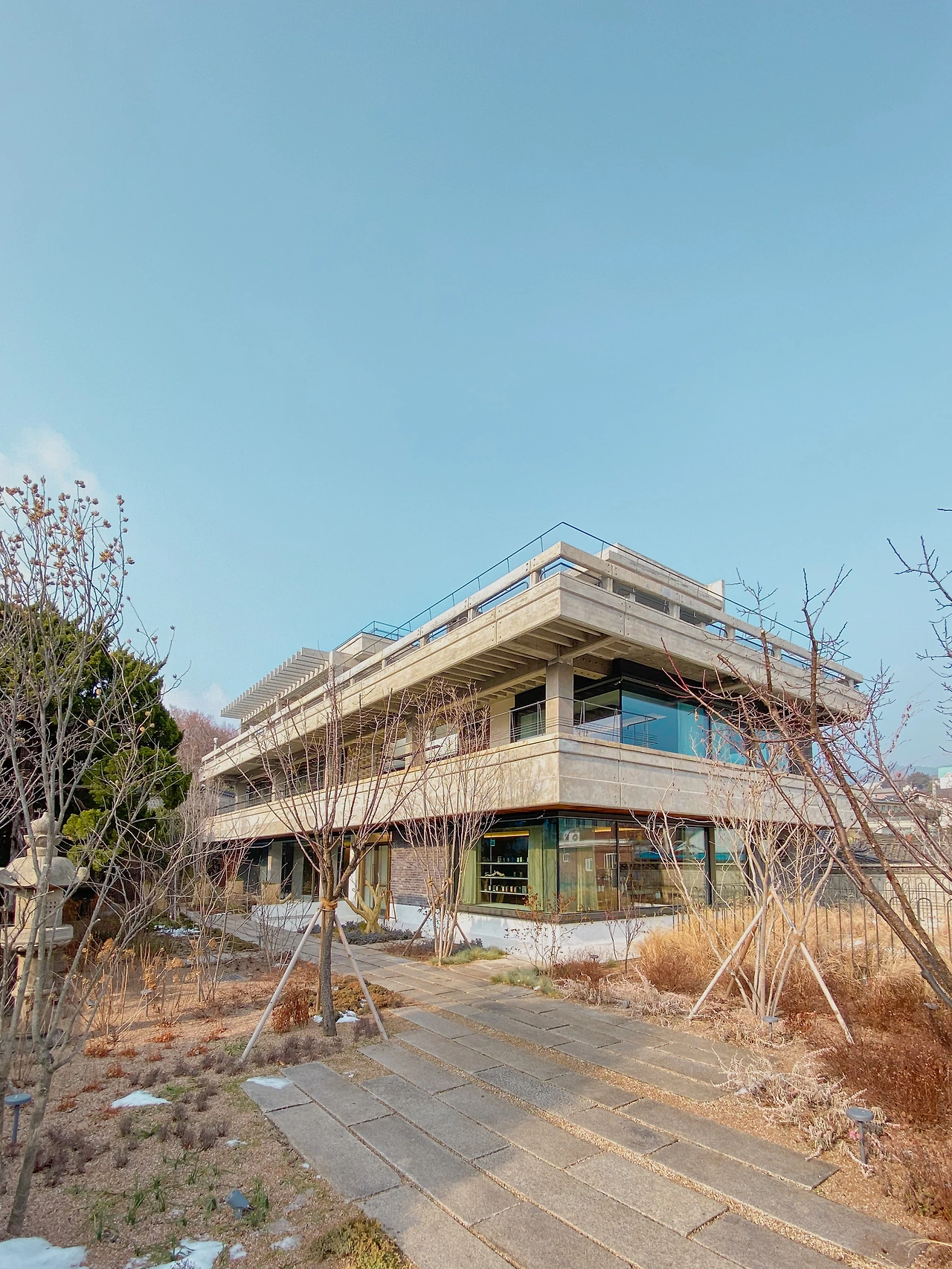 설화수 북촌을 보면 낮고 높은 많은 단이 있다. 한옥의 나무 기둥을 받치는 기단부터 양옥을 받치는 엄청나게 높은 단, 그리고 그사이 중정을 만들어내는 낮은 단과 내부의 공간을 분할하는 단까지, 다양한 높이와 역할을 하는 단이 모여 이곳을 구성한다. 밖에서 보면, 한옥보다 양옥이 높게 있고 그 거리가 가까워 자연스럽게 위계가 생긴다. 학교 운동장 단상 위에 올라간 사람의 지위가 높 듯, 이곳 또한 높은 단 위에 앉혀진 양옥의 지위가 높아 보인다.