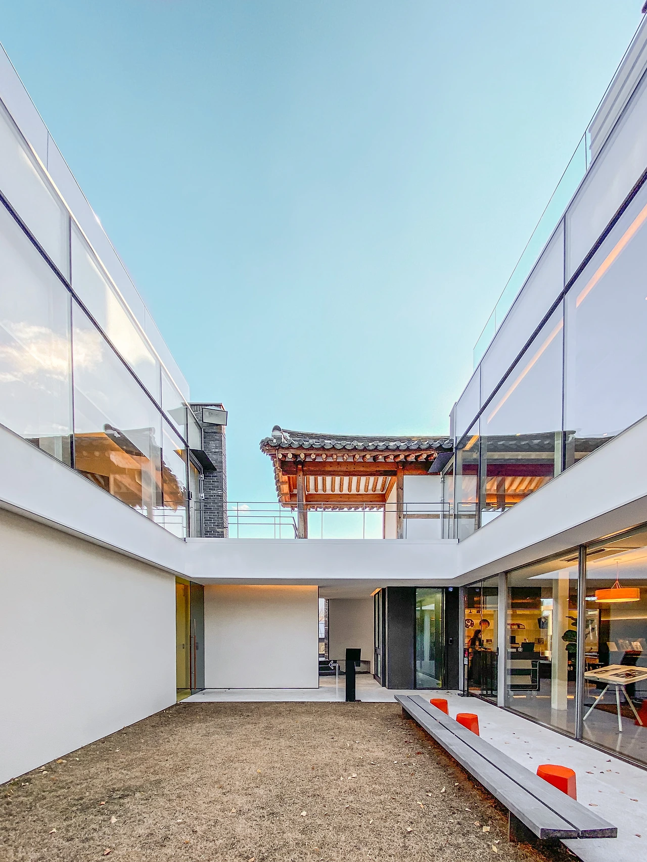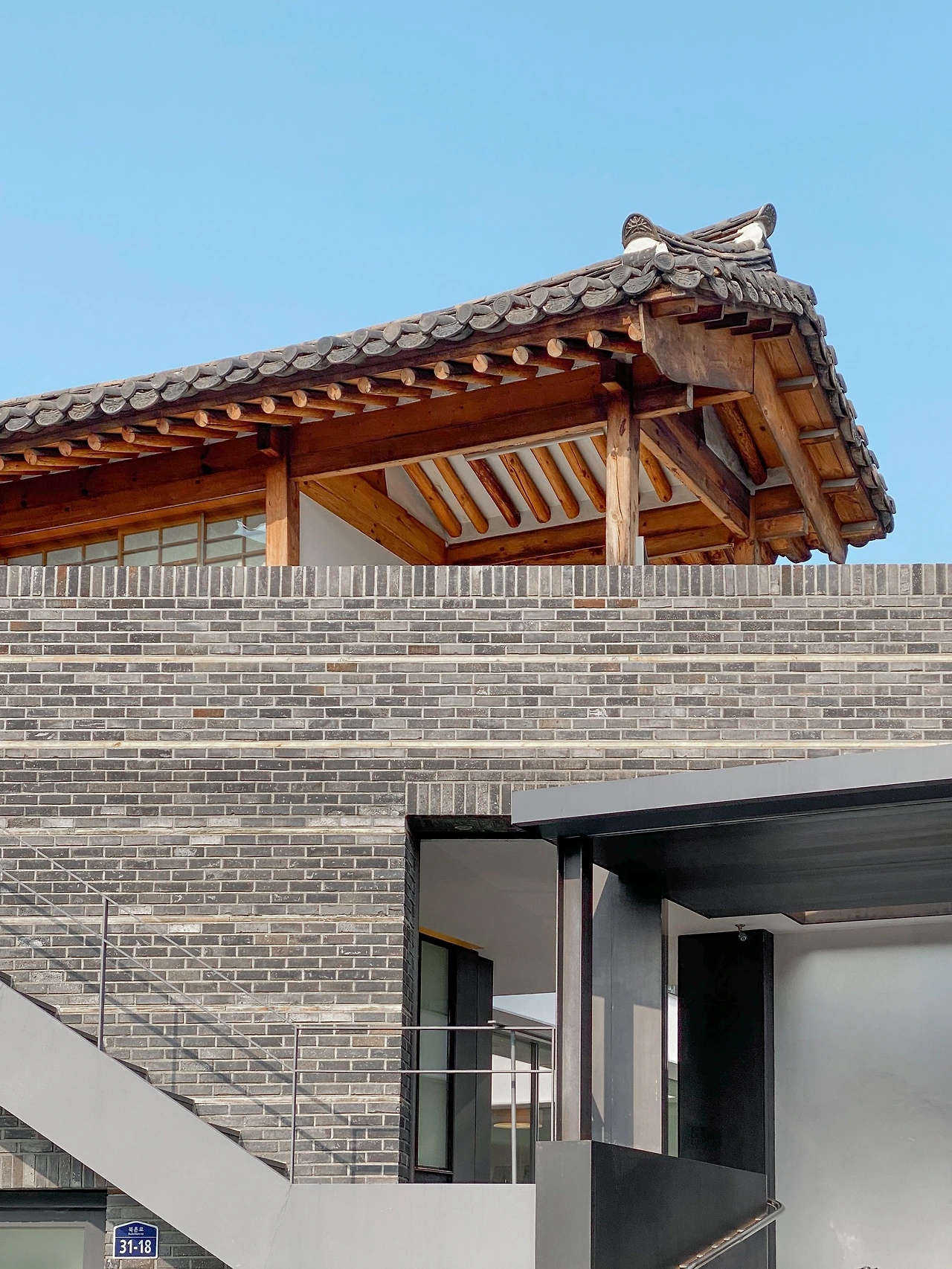 양옥 위에 한옥이 앉혀진 모습은 당연 건축을 전공하는 나에겐 호기심을 자극하기에 충분했다. 거기다 비스듬하게 놓여 있는 거며, 다른 동의 건물도 반듯하지 않고 비틀어져 배치된 모습이 어딘가 정돈되어 있지 않으면서, 동시에 자연스러움이 묻어나 마음에 들었다.