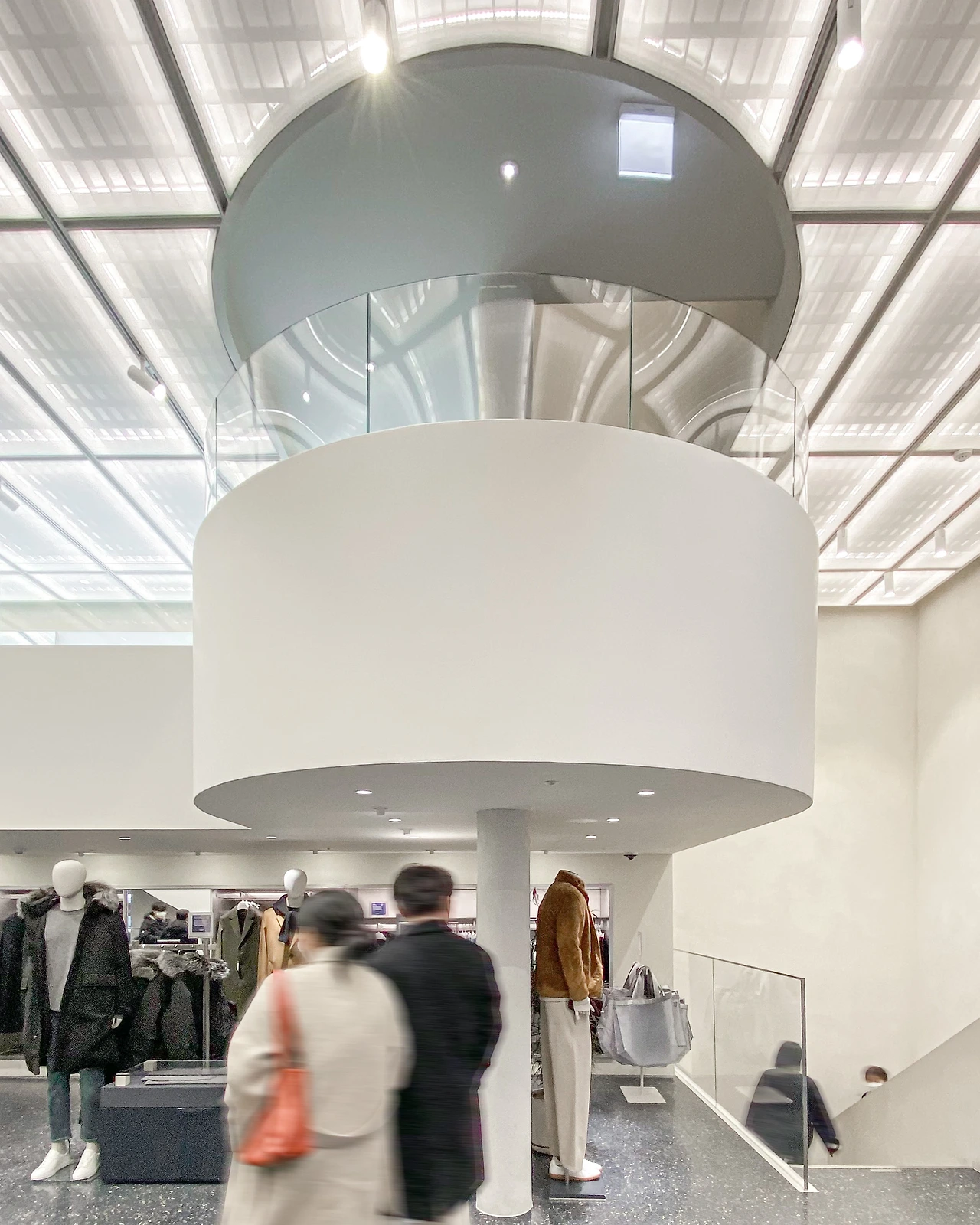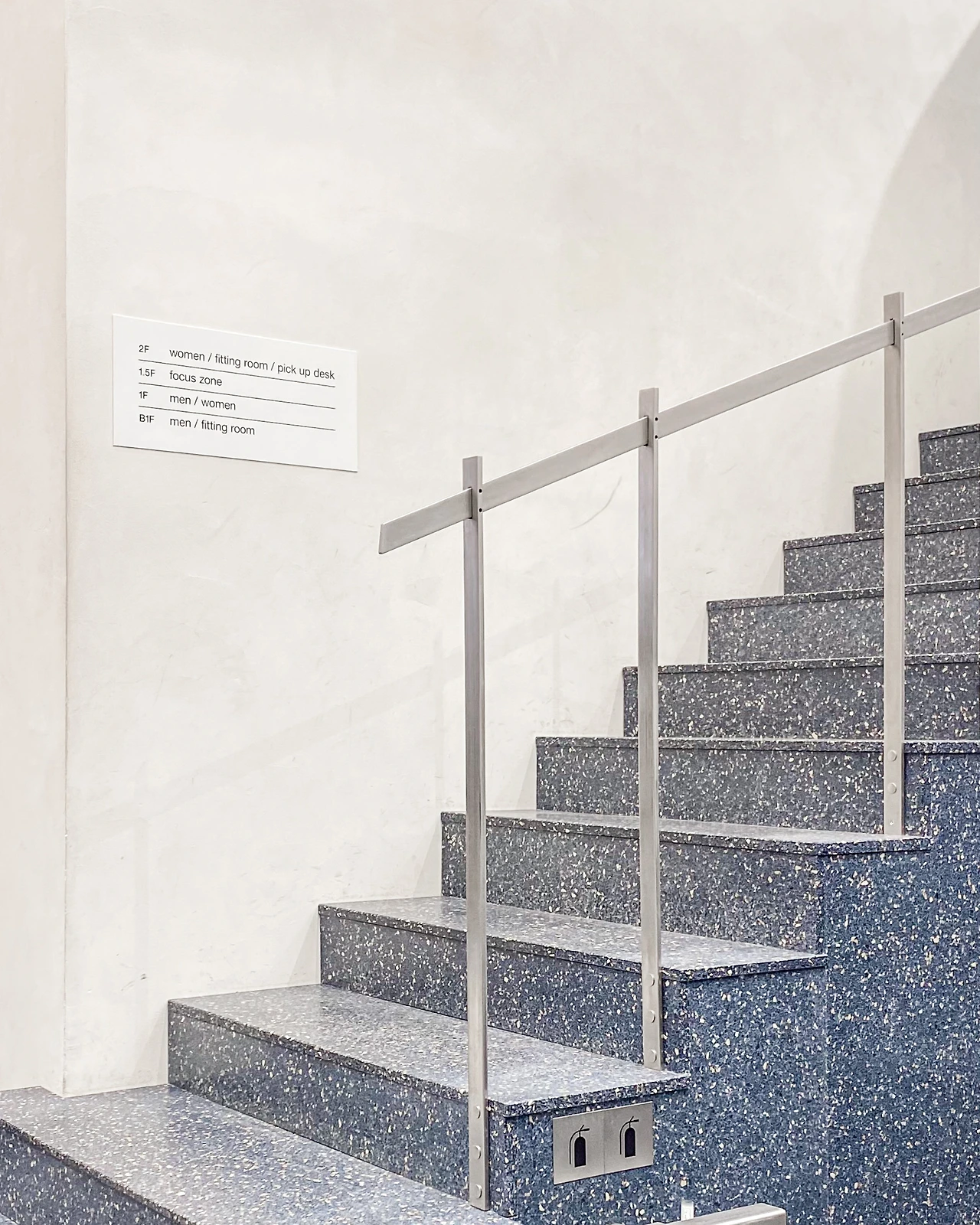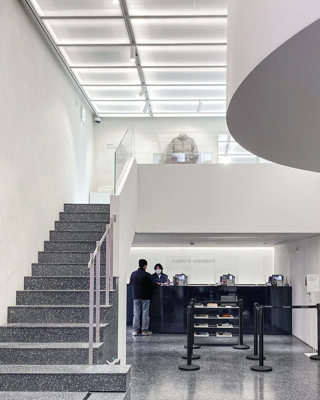 이곳은 어쩌면 가장 보편적이고 호불호 없는 답을 제시한 것 같다. 무난한 외관에 내부는 흰 벽으로 제품을 돋보이게 한다. 하지만 일반적인 SPA브랜드와 비교했을 때 공간 구성이 달라, 그곳의 경험은 무난하면서도 멋은 멋대로 챙긴 '무신사 스탠다드'의 특징이 잘 녹아들어 있다. 그 멋은 계단 난간, 조명, 매장 중간에 비치된 수직 디스플레이, 복층을 활용한 공간 구성을 통해 확인할 수 있다.