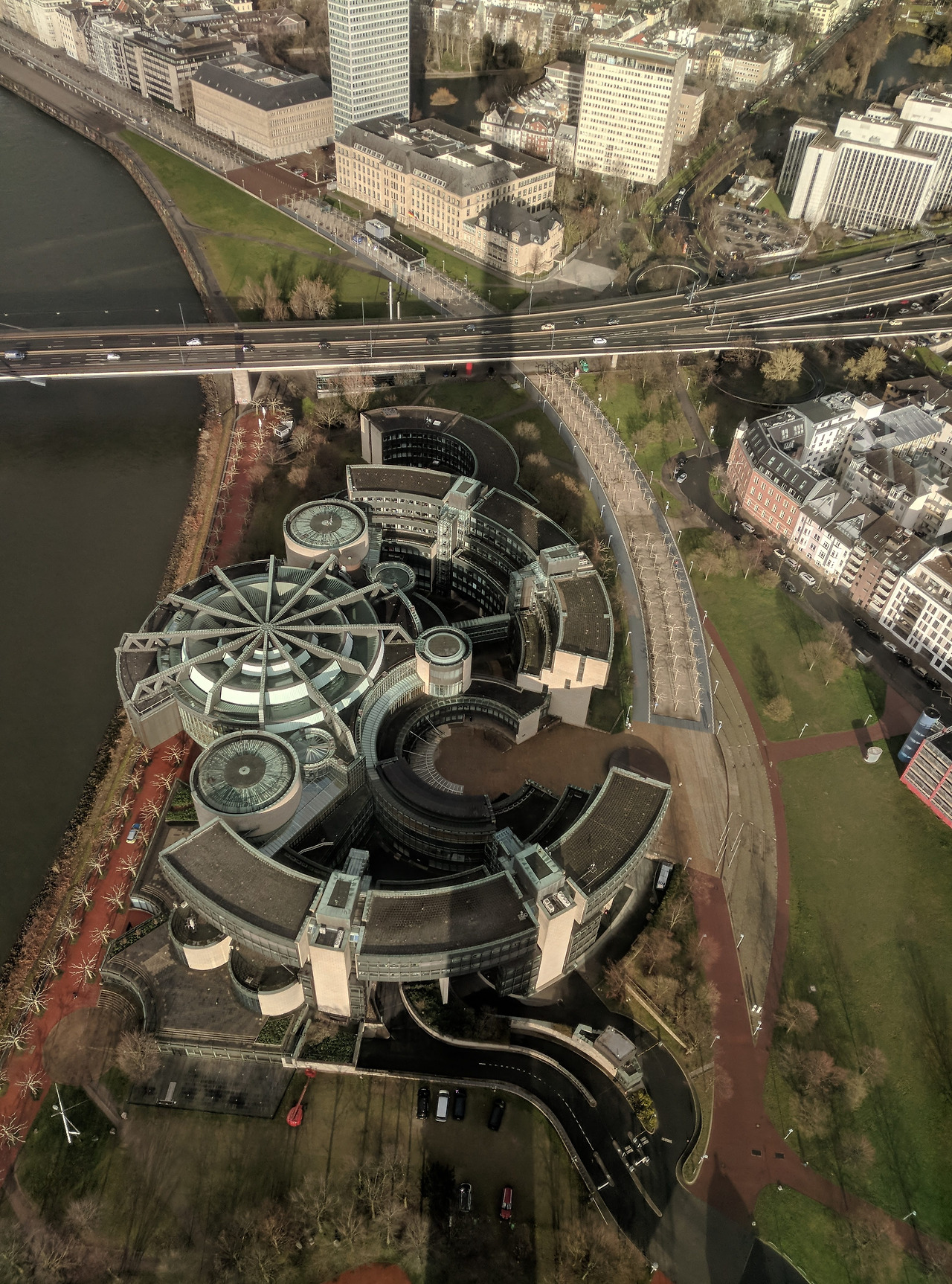 2008년에 지어진 이 건물은, 사실 겉에서 볼때는 곡면으로 이루어진 건물이구나, QR코드를 썼구나(...) 정도이고, 라인강변에서 들어가는 입구 쪽에서 보면 더 인상적이긴 한데, 개인적으로 이 건물의 진가는 라인타워에서 내려다볼 때에 알 수 있다고 생각한다.