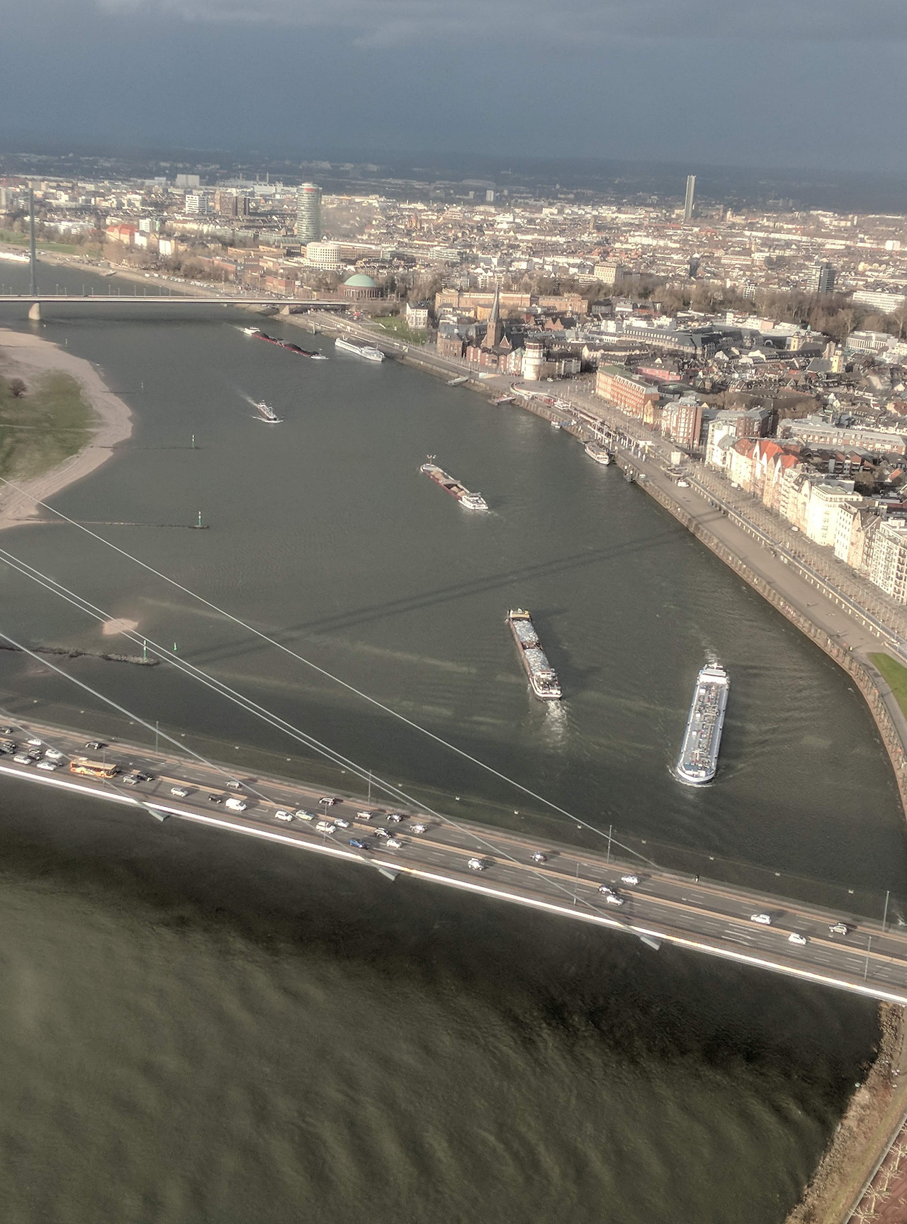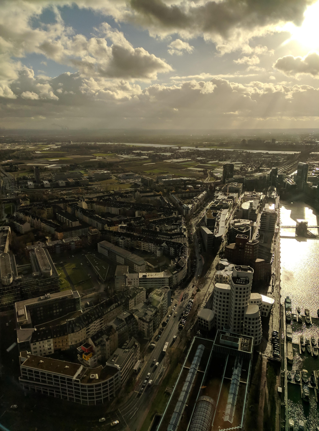 라인타워에서 내려다보면 다양한 풍경들. 왼쪽부터 순서대로 메디엔하펜 지역, 육안으로는 알트슈타트가 보였던 풍경, 라인강을 오가는 수많은 화물선들.