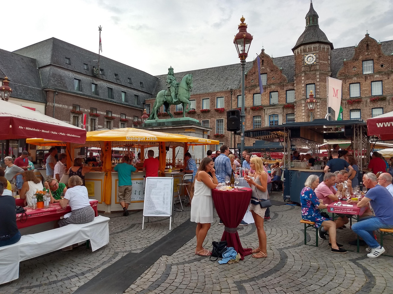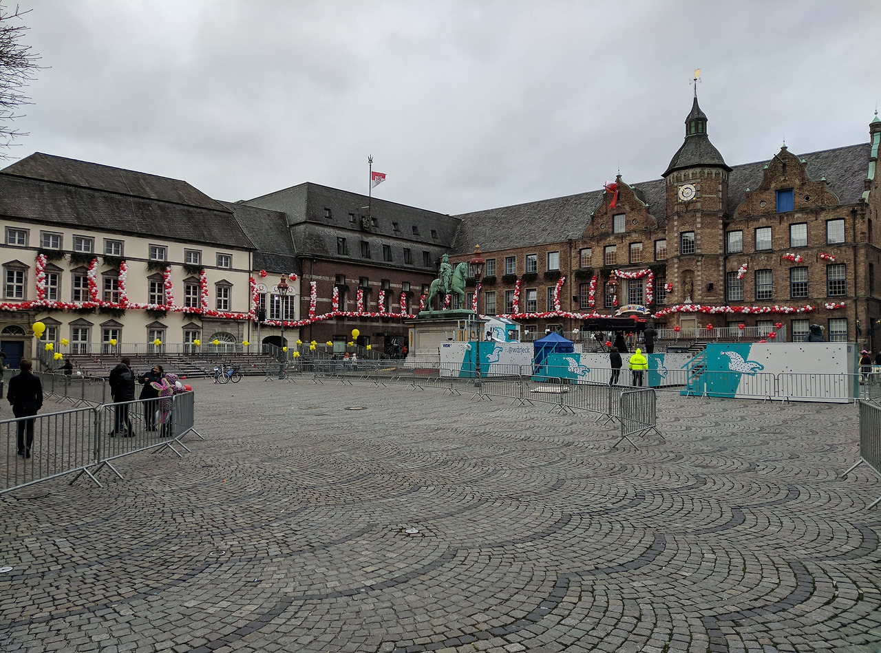 구시청사가 보이는 마르크트광장. 가운데 있는 기마상이 요한 빌헬름 2세. 카니발 기간이라 바리케이트가 쳐져 있다.