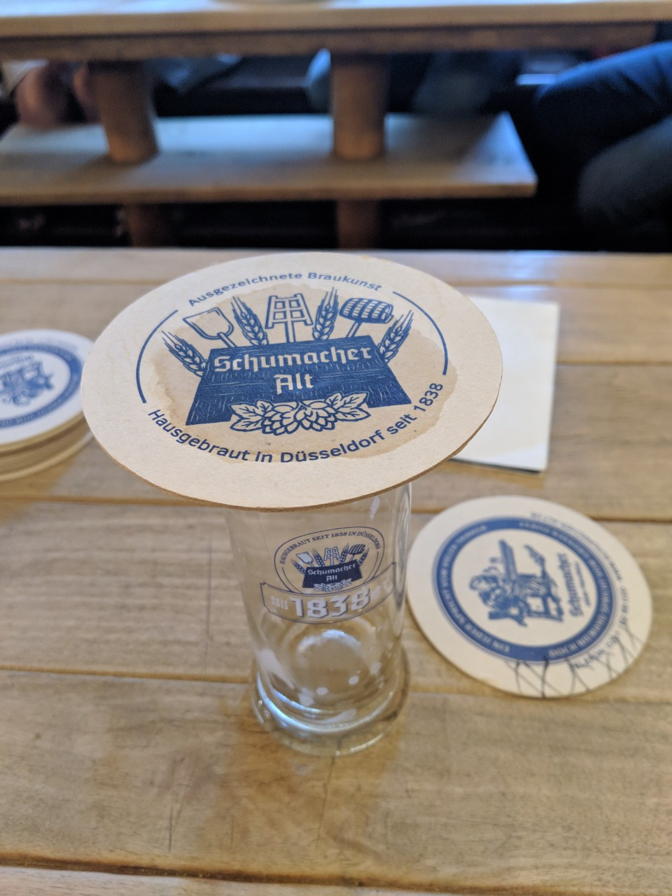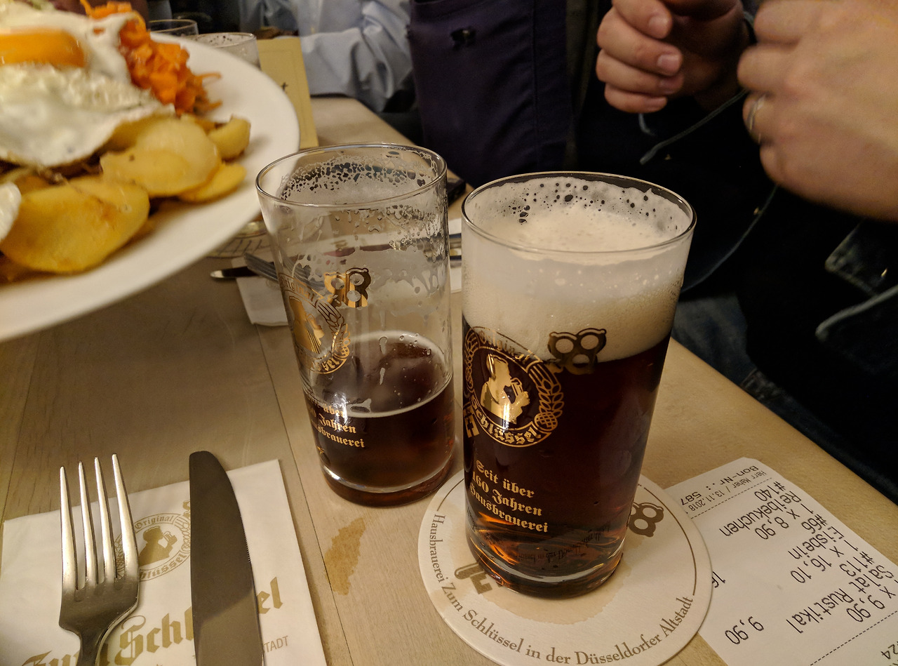 뒤셀도르프에 도착하고서 호텔살이를 하던 초반의 나날 중 하루에 우연히 이 도시에 잠시 머무르고 있던 사촌동생을 만나게 되었다. 잠시라고 해도 하루이틀차였던 우리보다는 꽤 오래여서, 기거하고 있는 집주인인 친구에게 몇 가지 주워들은 바 있는 사촌동생은 독일에 갓 온 우리를 독일 음식점으로 안내했다. 남편에게 드디어 진정한 학센을 소개해줄 수 있게 되었다는 설렘과 함께 자리한 우리에게 종업원이 다가와서는 너네 세 명이니? 하고는 끄덕일 짬도 안 주고 맥주를 바로 한 잔씩 던져놓는 게 아닌가! 그렇게 만난 것이 바로 알트비어. 브루어리마다 다르긴 하지만 기본적으로 우리의 맥주 글라스만 하거나 그보다 조금 작은 정도의 잔에 맥주를 잔뜩 담아서 막 온 손님이나 잔이 빈 손님에게 묻지도 따지지도 않고 새 술을 공급하는 것이 이쪽의 맥주 서빙 방식이었다. 쾰른의 가펠쾰시 브로이하우스에서도 그러하였고. 주문을 받아 맥주를 서빙하는 것이 아니기에 계산서에 따로 기록하지 않고 코스터에 그저 빗금으로 그 수만 센다.