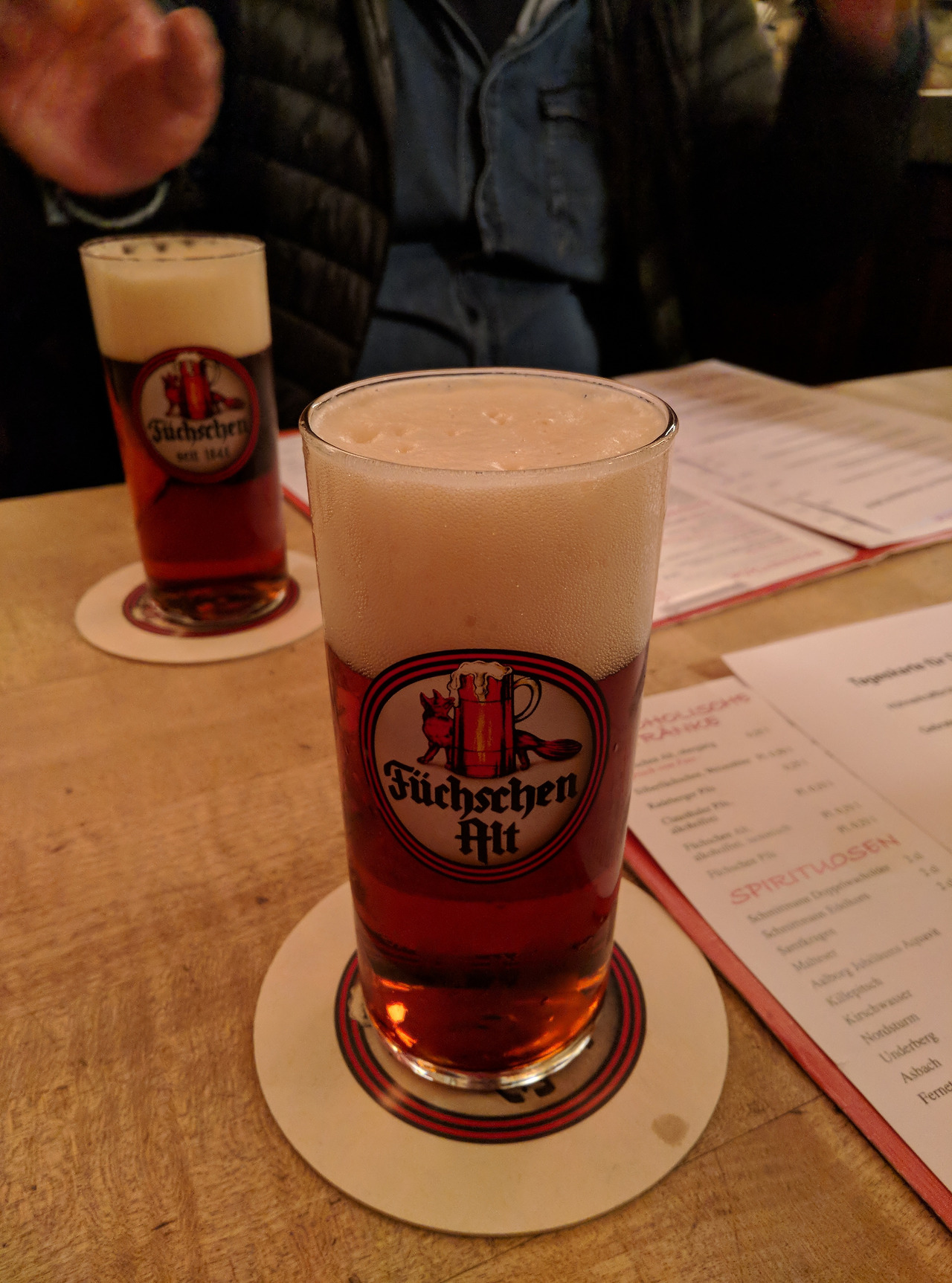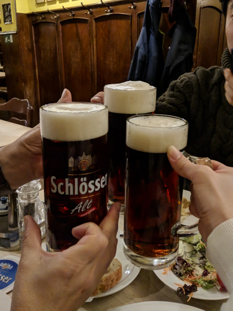 우리가 첫 발을 내디딘 뒤셀도르프는 맥주의 본고장 독일에서 지역 맥주가 잘 알려진 몇 도시 중 하나이다. 이를 남편은 고대하고 있었고, 이맛 저맛 다양한 맥주가 맛보는 게 정말 즐겁지만 그 경험이 데이터베이스화되지를 전혀 않는 나는 매번 그게 어떤 맥주라고 들어봤자 음 그렇구나 하고 넘어가기를 수차례였었다. 어쨌든 소개하자면, 이 고장의 맥주는 '옛날 맥주'라는 뜻의 알트비어(Altbier)이다. 맥주의 종류에 관해 조금이라도 관심을 가져본 사람이라면 발효 방식에 따라 크게 에일과 라거 두 종류로 나뉜다는 것을 한 번쯤은 들어봤을 터인데(물론 못 들어봤고 헷갈려도 된다. 나도 하면이 라거임을 매번 다시 묻거나 찾아봐야 알..), 이 중 라거의 하면 발효 방식이 개발되기 이전에 만들어진 맥주라고 하여 이런 이름이 붙었다고 한다. 그렇게 치면 모든 에일이 다 올드인 것인데 왜 얘만 굳이 일반명사 같은 것을 고유명사로 두르고 있는지 모르겠으나..