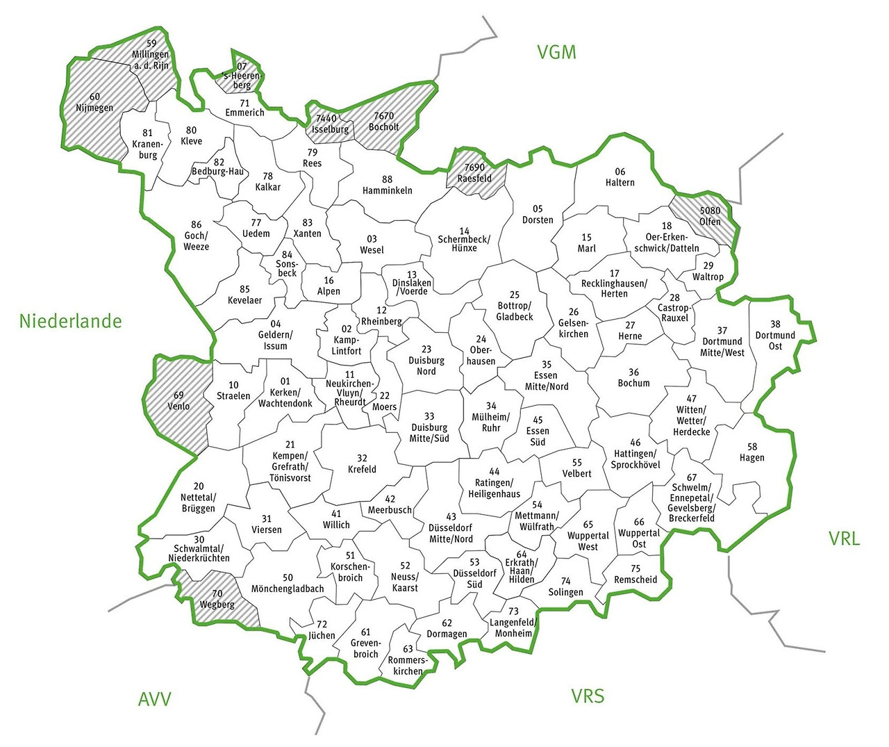 영티켓플러스로 다닐 수 있는 VRR 권역. 좌측의 우상향 빗금 지역이 네덜란드다. 저녁 7시 이후와 주말에는 동반 1인도 가능하다.