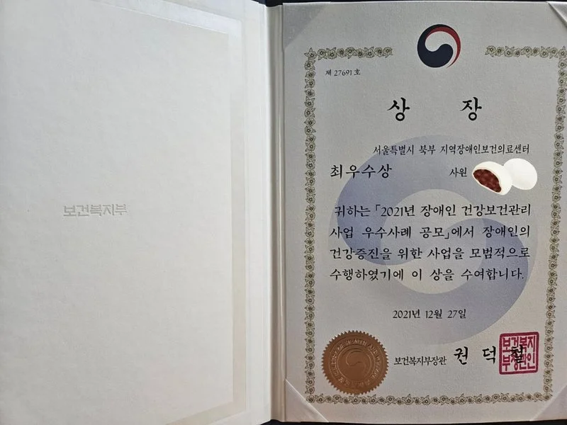 특히, 중증 장애인의 경우 가정 방문형 의료서비스(방문의료)를 통해 욕창, 도뇨관, 약물 관리 등이 이뤄져야 했습니다. 그래서 1년간 서울북부 14개 자치구에 위치한 의료기관 중 방문 의료(방문간호, 방문진료)를 제공하는 곳을 직접 찾아다녔습니다. 그 결과 방문 의료를 제공하며 실질적으로 기능하는 장애인건강주치의 기관을 자치구별로 1~2개 추릴 수 있었습니다. 어찌 보면 자치구 단위로 장애인이 지역사회에서 건강관리를 할 수 있는 생태계를 꾸리는데 초석과 같은 역할을 한 것입니다. 이러한 사업의 공로를 인정받아 2021년 장애인건강 보건 관리 우수사례로 보건복지부 장관 최우수상을 수상하였습니다.