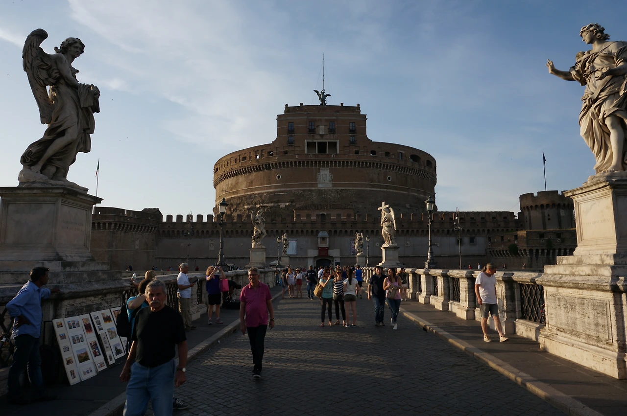 산탄젤로 성은 성천사 성이라는 뜻으로 로마제국의 황제 히드리아누스가 자신과 가족을 위해 세운 무덤이었다. 네모난 성벽 안에 둥근 모양의 성이 들어가 있는 독특한 형태인데, 바티칸 시국과 산탄젤로 성은 지하도로 연결되어 교황의 피난처, 요새 등으로 쓰였다. 지금은 이탈리아 군사박물관으로 사용되고 있다. 산탄젤로 성에 연결된아치 모양의 다리 아래로 로마의 젖줄 테베르 강이 흐른다. 건설하는데 백 년이 넘게 걸린 다리는 성천사 조각들이 시립 하여 문지기처럼 성을 지키고 있다.