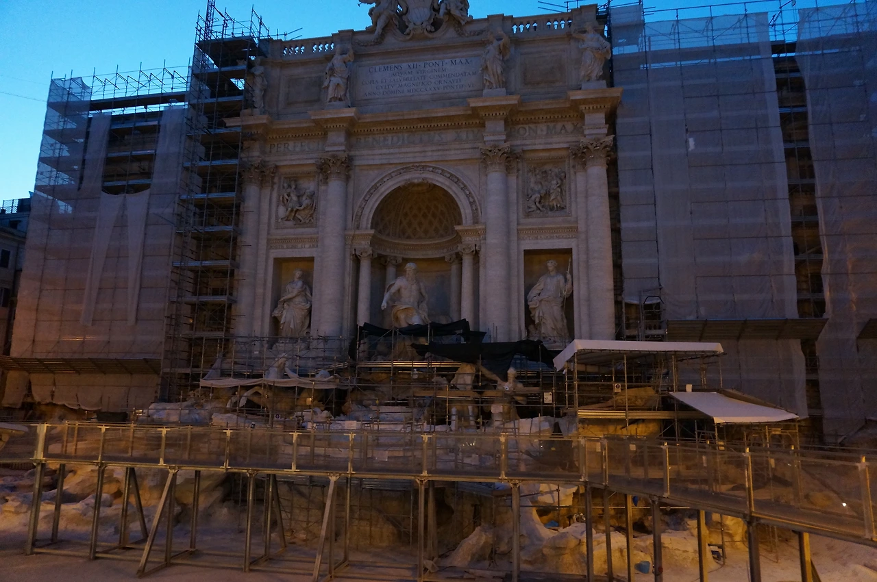 트레비 분수는 찾기 어려웠다. 애타게 찾아 헤매었다. 판테온에서 7-800m 거리였지만 길을 찾지 못해 주변을 뱅글뱅글 돌았다. 길을 찾아 헤매다 궁전을 발견했는데, 마다마 궁전이었다. 멋진 근위병 복장(?)의 경비병이 정문을 지키고 있어서 기억에 남는다. 알고 보니 이탈리아 공화국 상원 건물이었다. 어쩐지 검은색 세단이 많이 주차되어 있었다. 천신만고 끝에 찾은 트레비 분수는 공사용 비계로 뒤덮여 있어 힘이 쫙 빠졌다. 가는 날이 장날이었다.