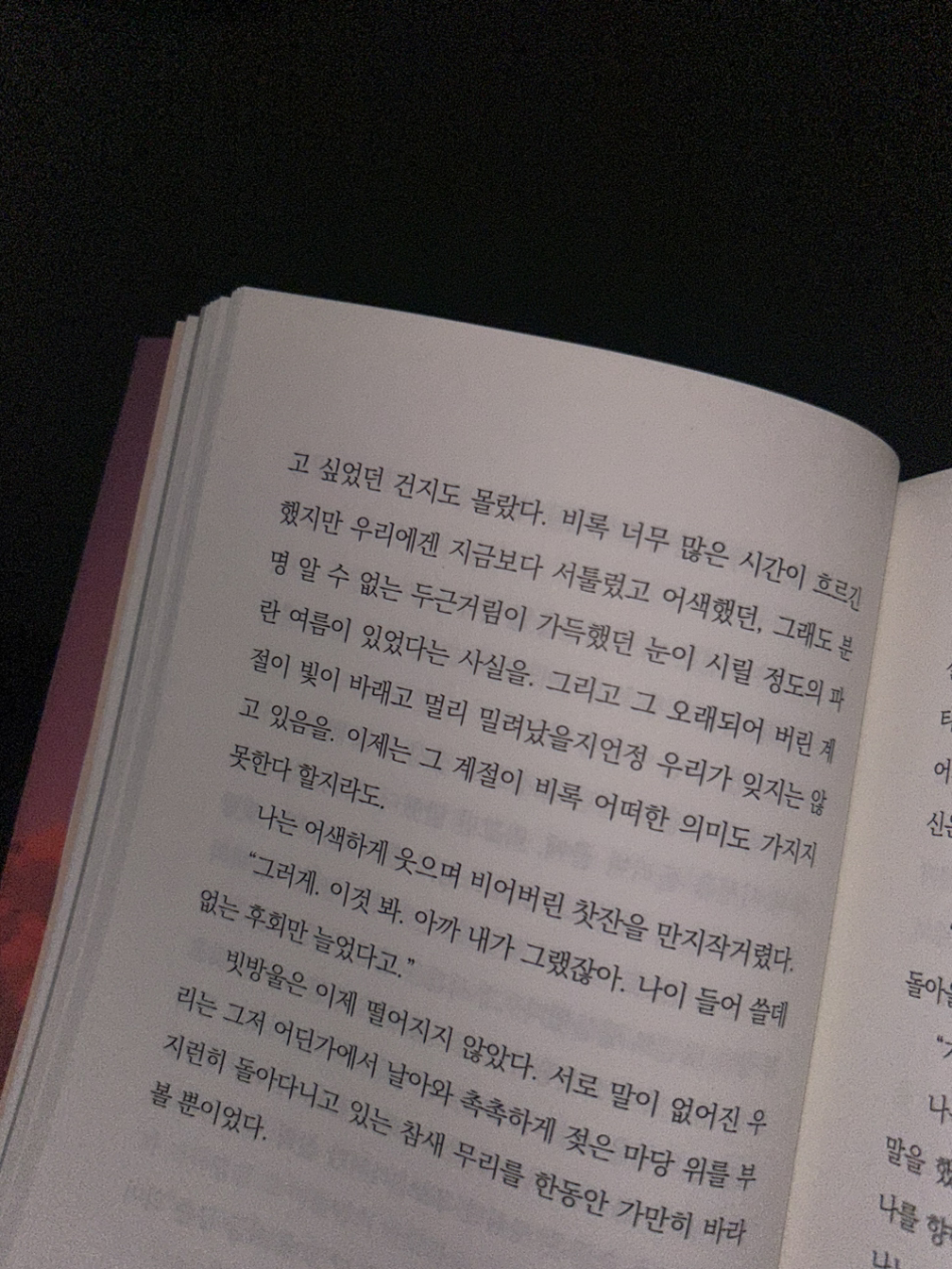 이렇게 변화하는 계절들과, 변화하는 사람들이지만, 그럼에도 어떤 순간에는 소설 속의 인물들처럼 그 사람을, 그 모습을 떠올리게 되는 순간이 올 거라 생각한다. 떠올리는 과거의 순간 속의 그 사람은 없겠지만, 그 순간만큼은 그대로 남아 있는 법이다. 과거의 그 순간을 떠올리는 것은 또 현재의 우리를 조금씩 바꾸어 놓을 테다.