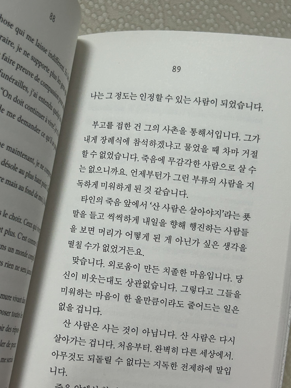사랑하는 이의 죽음은 한 사람의 삶을 뒤흔든다. N이 말하듯, '산 사람은 살아야지'라는 말이란 참 이상하고 잔인한 것 같단 생각을 한다. "산 사람은 사는 것이 아닙니다. 산 사람은 다시 살아가는 겁니다. 처음부터. 완벽히 다른 세상에서. 아무것도 되돌릴 수 없다는 지독한 전제 하에 말입니다." N의 이 말이 딱 맞는 것 같다. 한 사람이 내 세상에서 사라진다는 것은 내 세상이 송두리째 바뀌는 것과도 같다. 어찌 이런 세상에서 아무렇지도 않게 살아가겠는가?