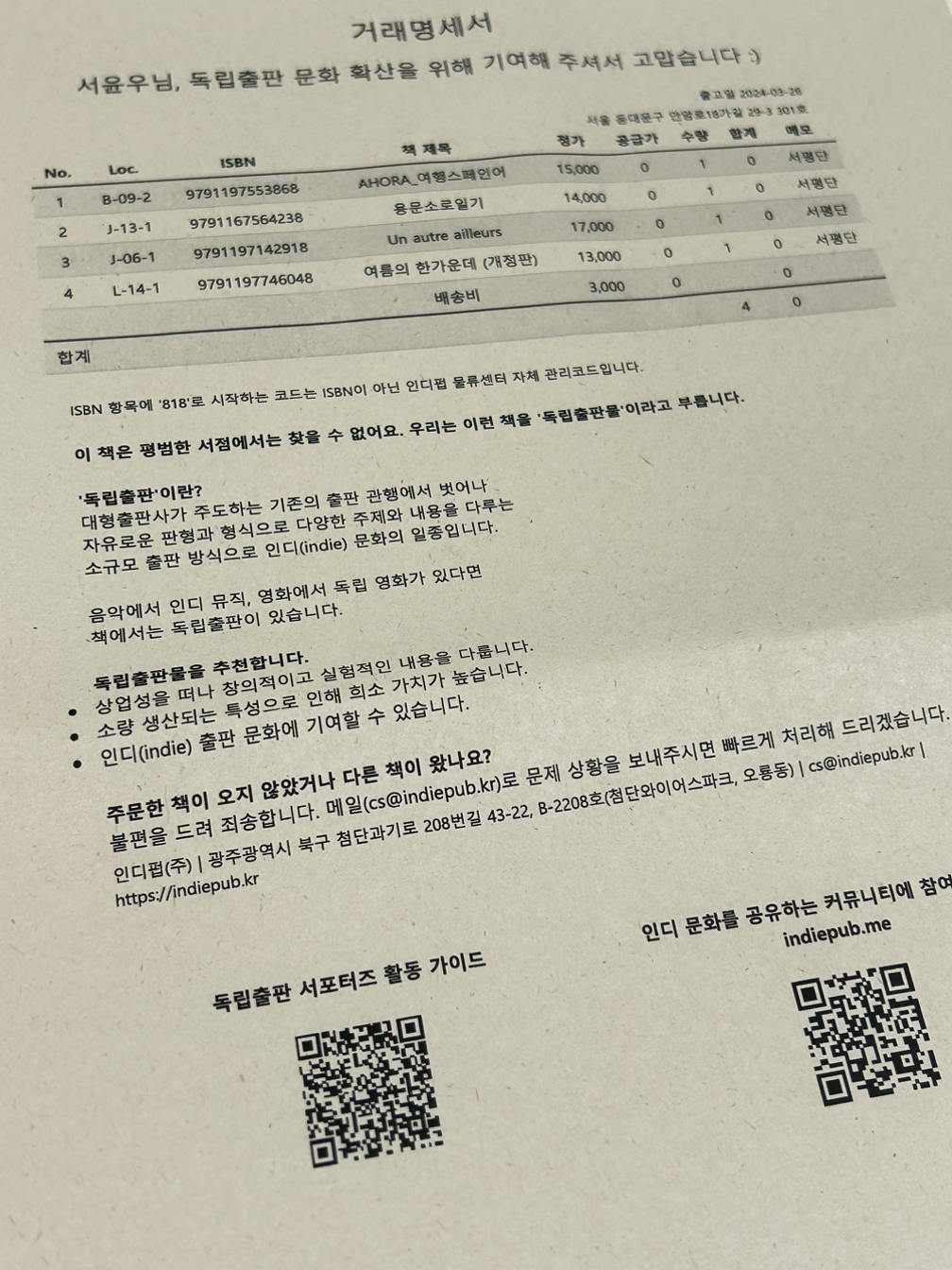 이렇게 네 권의 책을 주문했다! 택배를 뜯으면 바로 보이는 거래명세서에 여러 내용을 담아서 준 점도 개인적으로 마음에 들었다. 엄청나게 상세하고 깊이 있는 내용은 아니지만 이렇게 써 두니까 하나하나 세심하게 읽게 된달까?