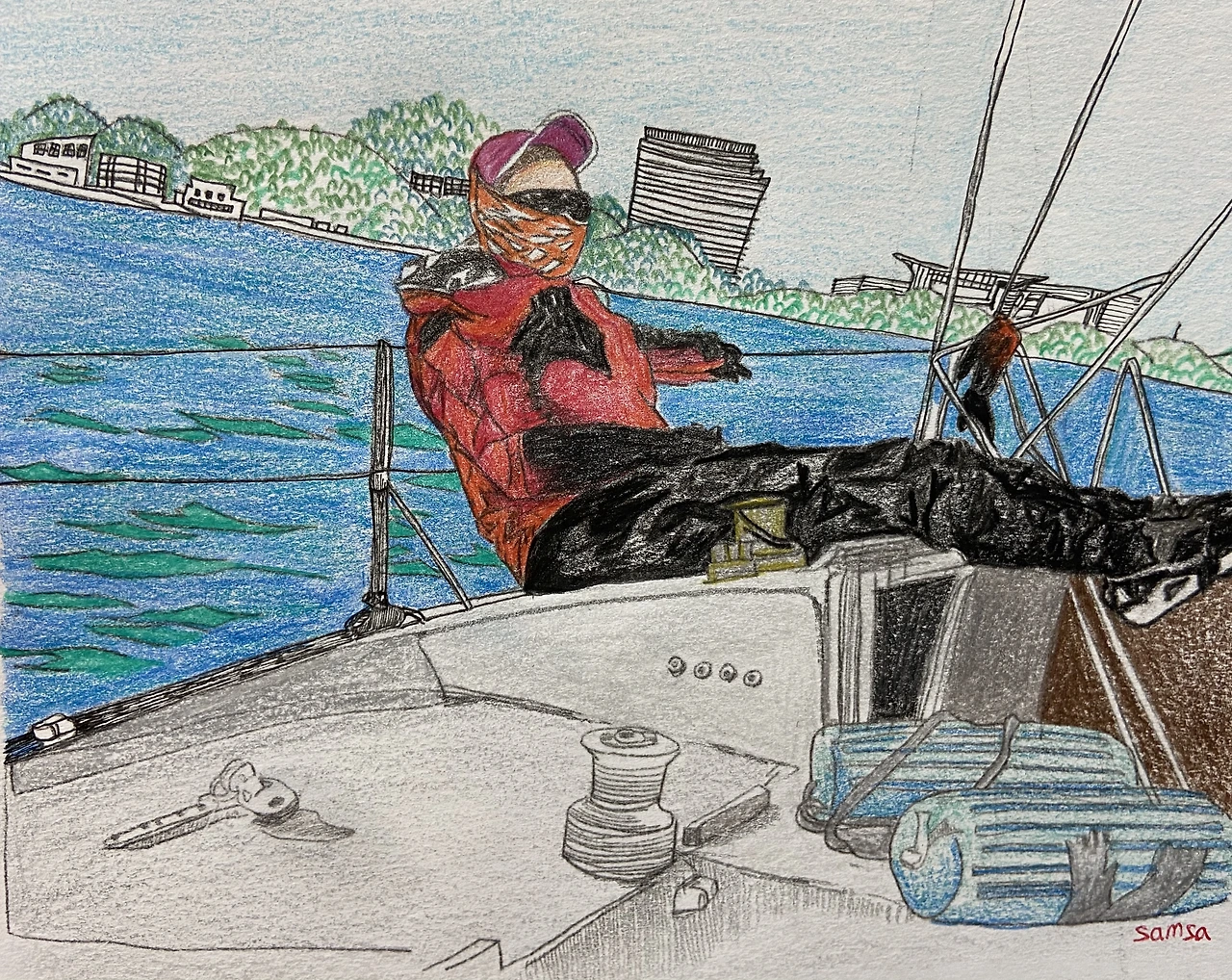 장비 욕심도 없고, 시선에 개의치 않는 편이라 함께 세일링 하는 친구가 준 요트대회 기념품 모자를 쓰면서 세일링을 하고 있다. 세일링용 모자는 뒤편에 집게 달린 끈이 연결되어 있어서 옷과 연결시킬 수 있는데, 바람이 불어 모자가 벗겨지더라도 잃어버릴 염려가 없다. 이미 많이 가지고 있는 요가용 레깅스나 서핑용 반바지, 래시가드를 입고 문제없이 요트를 탔다. 그런데 몇 번 바다 항해를 나갈 기회가 생기고, 바다에서 시합을 하게 되고, 슬슬 날이 추워지기 시작하니 세일링 전용 의류의 필요성이 느껴졌다.