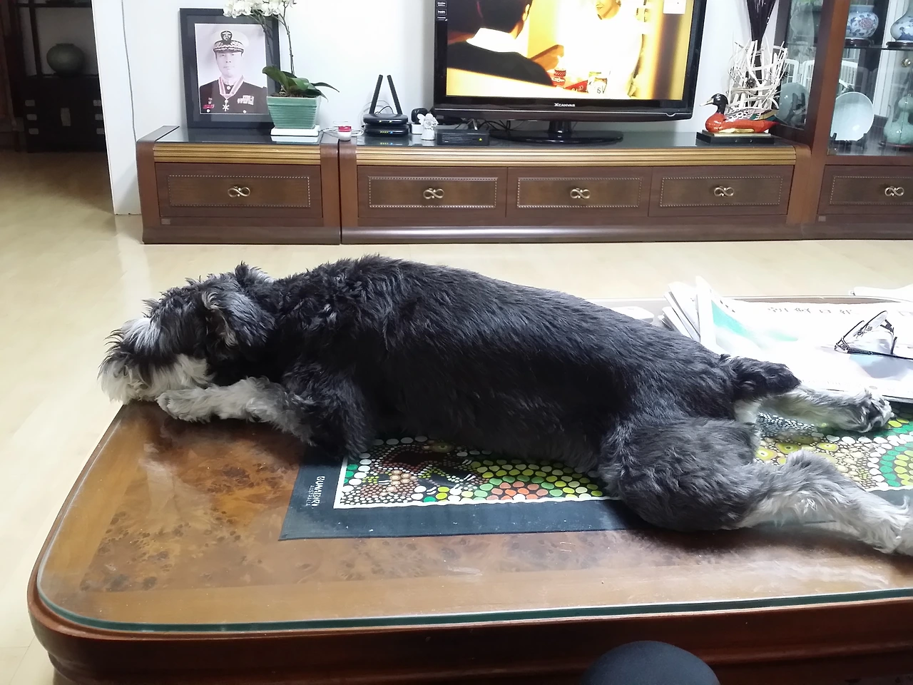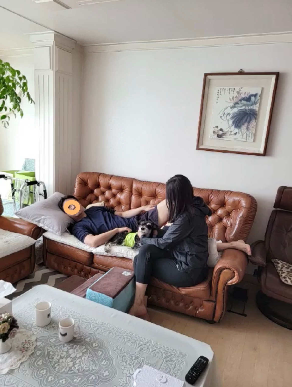 서열 이야기는 농담이 아니다. 슈렉이는 마사지를 무척 좋아한다. 그래서 이 집에서 슈렉이보다 서열이 낮은 사람은 쉼 없이 슈렉님 마사지를 해 드려야 하는데, 대표적으로 서열이 낮은 사람은 엄마인 나이다. 여기에 올해 새로 추가된 서열이 낮은 사람이 있으니, 남동생의 아내인 나의 시누이이다. 새 식구이므로 서열상 꼴찌라는 것을 슈렉이는 본능적으로 알고 있었다. 집에 오면 그녀는 쉬지 않고 슈렉이를 쓰다듬어야 한다. 그러다 보면 남동생과 그의 아내가 상반신, 하반신을 나누어 마사지하는 이런 장면이 연출된다.