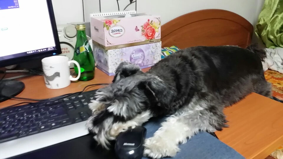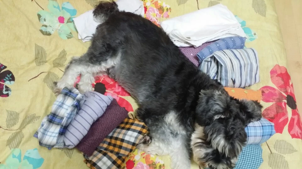 강아지들이 잔디밭이나 흙 밭에 뒹구는 것을 좋아하니까 더러운 것을 잘 모르거나 혹은 좋아하는 것 같지만 꼭 그렇지만도 않다. 슈렉이는 주로, 빨래를 게기 위해 걷어놓은 새 옷 위에 떡 하니 올라가 자리를 잡는다. 빨아야 할 더러운 옷 더미에는 안 올라가는데 귀신같이 새로 한 깨끗한 빨래 위에만 올라가는 것을 보면 새 빨래가 뭔지 아는 것 같다. 새 빨래 냄새가 좋은 건가.