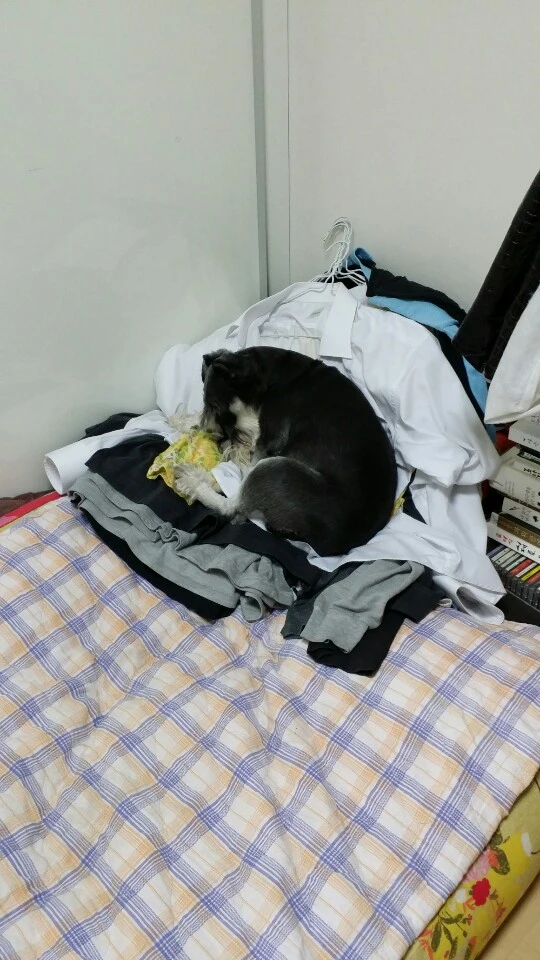 그러니까 이게 다 서열의 문제란 말이다. 슈렉이는 자기가 이 집의 왕이니까 새로 빨아놓은 옷에도 자기 냄새를 묻혀야 하는가 보다.