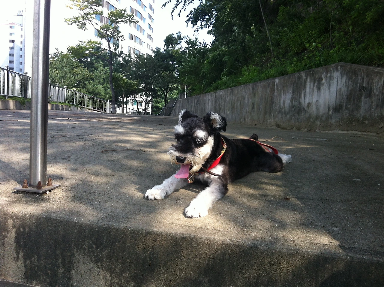 그러고 보니 슈렉이의 주특기는 산책이라 할 수 있겠다. 어려서는 산책을 하다가 힘들면 땅바닥에 철퍼덕 퍼지기 일쑤였다. 그러면 아무리 어르고 달래도 일어나지 않아 집까지 안고 돌아와야 했다. 그런데 지금은 1시간, 2시간을 걸어도 못 가겠다고 엉덩이를 대고 앉거나 바닥에 없드려버리는 일 없이 끄떡 없이 잘 걸으니 말이다.