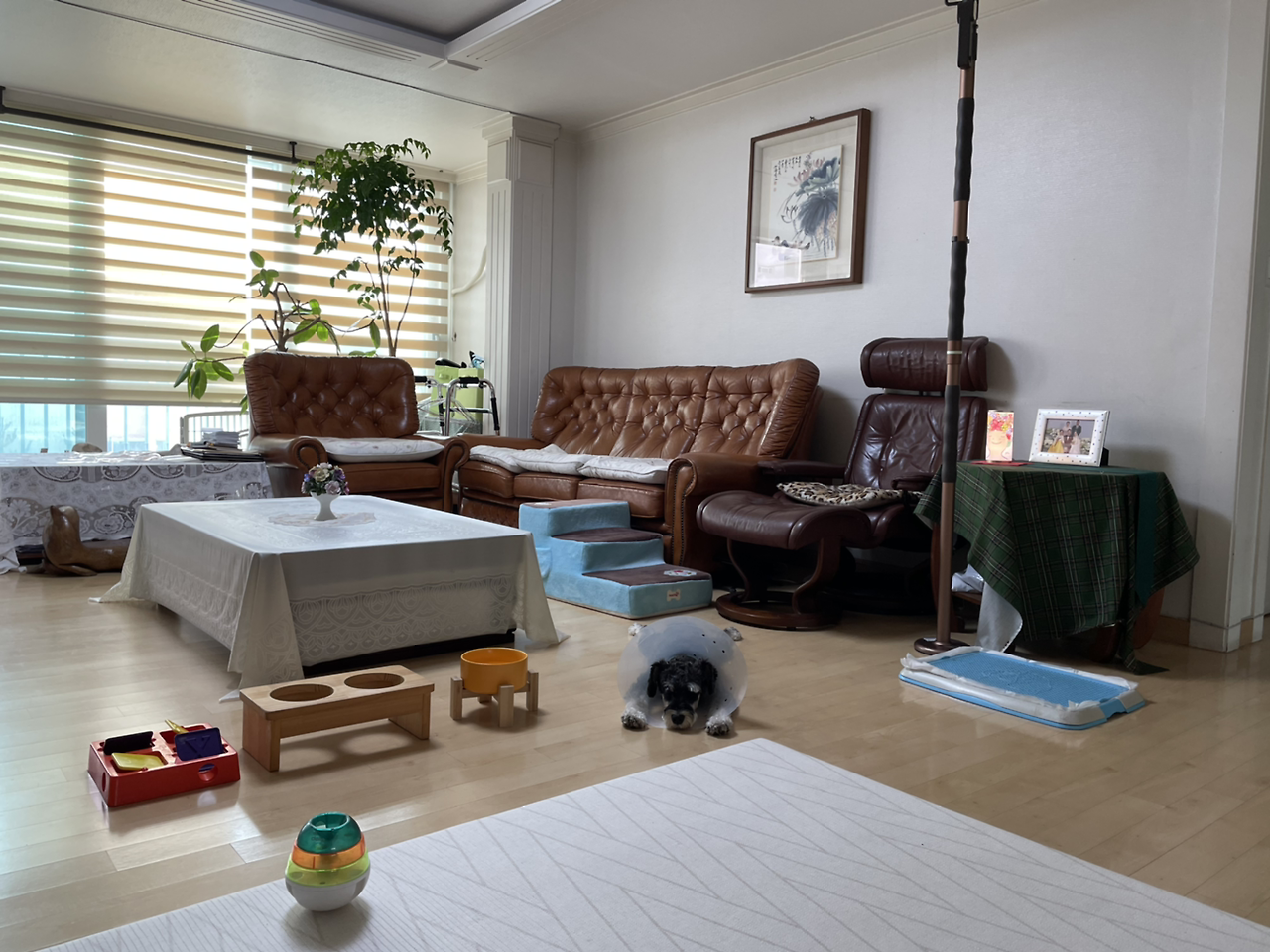슈렉이는 집안에서 볼 일을 보지 않지만 그래도 만약을 대비해 어릴 때 쓰던 배변패드가 항상 깔려 있고, 시원한 물을 담아놓는 물그릇, 그리고 밥그릇을 올리는 슈렉이 식탁이 놓여있다. 그밖에 노즈 워크 장난감 몇 종은 기본이다. 그나마 슈렉이는 이제 베이비가 아니라 인형 장난감 같은 것은 잘 안 갖고 노니 이 정도이다.