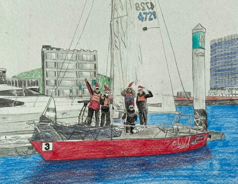 요트 대회 날 아침, 다른 팀들이 비장하게 범장(요트를 세팅하는 것)하는 동안 우리는 빨간 선체에 크리스마스 장식 스티커를 붙이고, 요트 뒷부분의 백스테이(세일을 달기 위해 우뚝 선 마스트를 고정해주는 사방의 지지대 중 요트 뒷부분에 달린 것)에 반짝이 장식을 하고 산타 모자를 쓰고 셀카를 찍느라 분주했다.