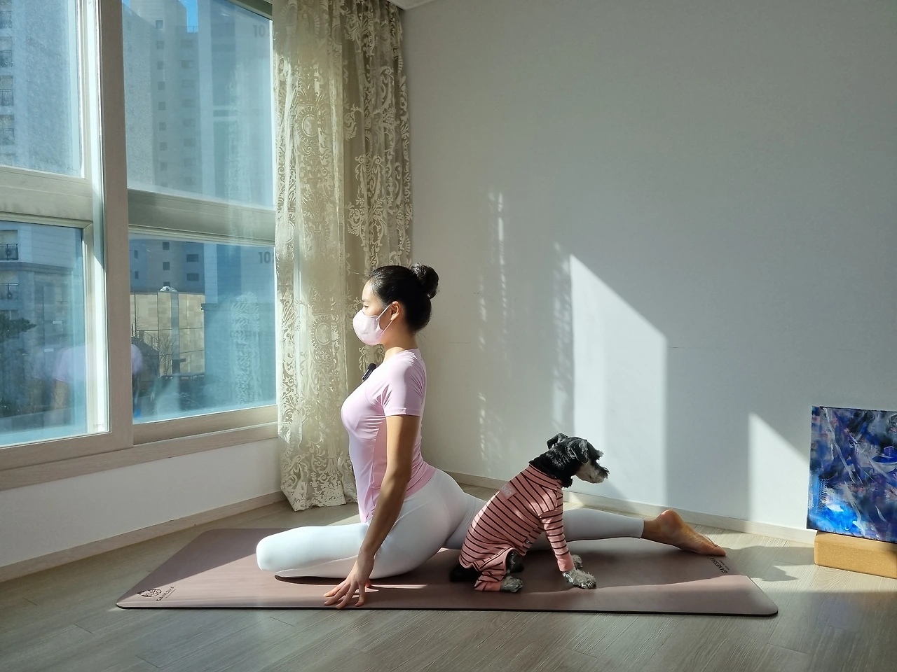 슈렉이는 도그 파트니스 센터 대신 엄마랑 홈요가 해요.