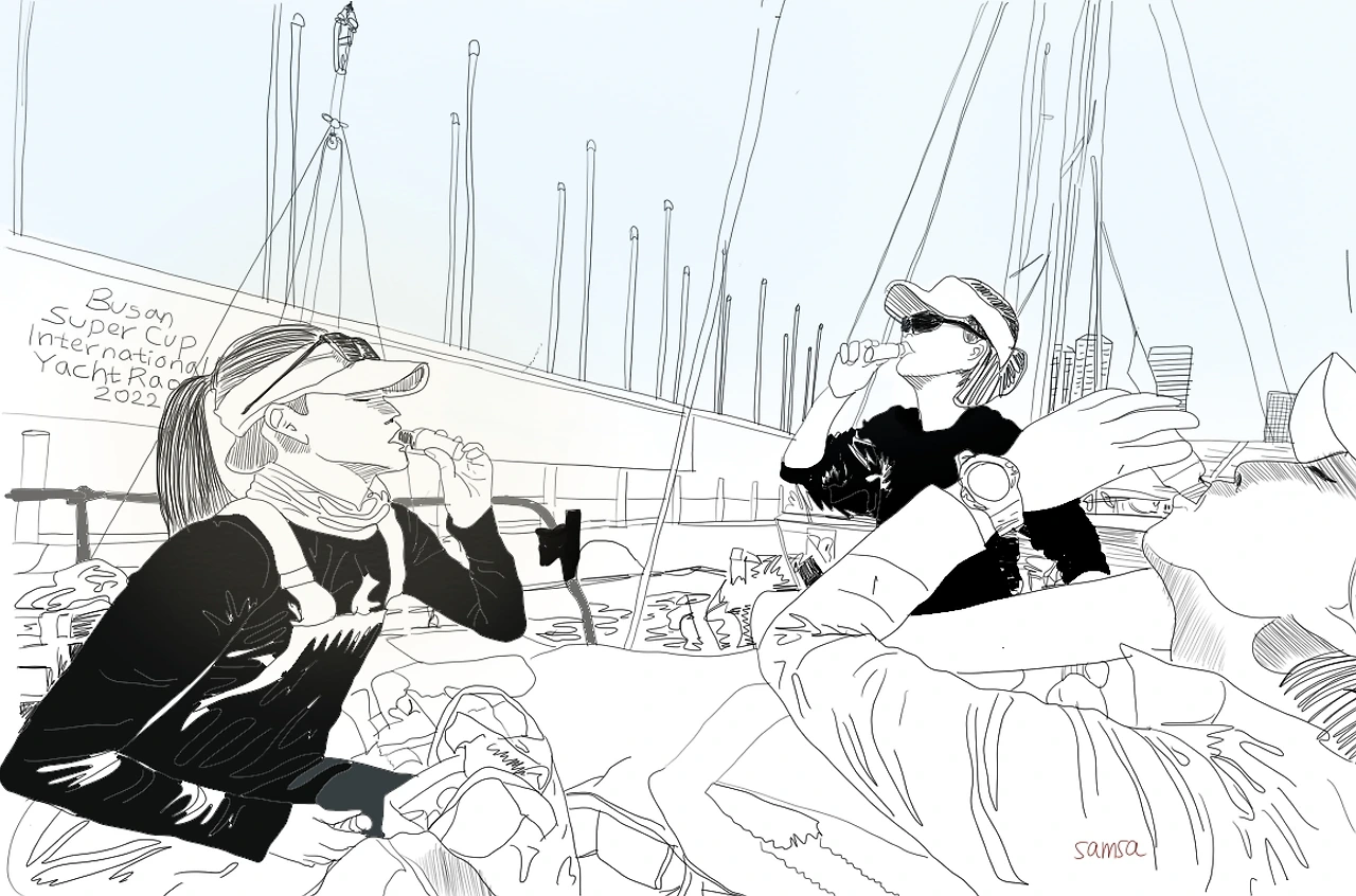 평소에 비교적 안전하고도 안정적인 김포 수역에서만 연습을 하던 우리는 첫 부산 경기를 하며 뱃멀미로 호된 신고식을 했다. 평소 우리는 요트경기를 갈 때마다 맛 집을 찾아다니느라 식사 스케줄이 빡빡한 팀인데, 아무도 아무것도 먹을 수가 없는 상황이 되었다. 스키퍼 언니는 숙소에 들어오자마자 말없이 묵은지 김치찌개를 끓이기 시작했다. 요트팀 스키퍼는 요트 운전만 하는 게 아니라 이렇게 엄마손 맛 찌개까지 끓여준다는 사실! 이것이야 말로 독일 메르켈 총리에 버금가는 진정한 어머니 리더십이 아닌가.