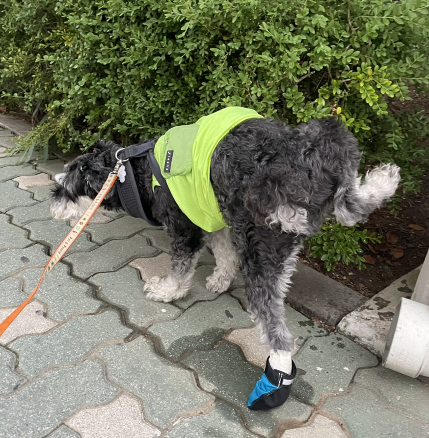 야속하게도 슈렉이가 발톱을 뽑은 지난주에는 폭우가 쏟아졌다. 실외배변견 슈렉이는 아무리 비가 많이 와도 우비에 우산까지 쓰고 시간을 맞춰 4번의 산책을 나가지만, 붕대는 쉽지 않았다. 부랴부랴 고무 재질의 강아지 방수 장화를 주문하고, 택배가 도착할 때까지 임시로 집에 있는 신발을 꺼내 신겼다. 슈렉이가 어렸을 때 눈 위에 뿌리는 염화칼슘이 발바닥 피부를 손상시킬 것이 걱정되어 샀으나, 슈렉이가 완강히 거부해서 한 번 신고 포기했던 신발이다. 이미 붕대가 감겨 있어서인지, 네 발 중에 한 발에만 신겨서 인지 이번에는 크게 거부하지 않고 잘 걸었다. 산책 중에 만난 어떤 분이 “그런데 왜 신발을 한짝만 신었나요?” 라고 묻길래 대답해드리긴 했지만, 이게 신발을 싫어하는 슈렉이에게는 최선이다.