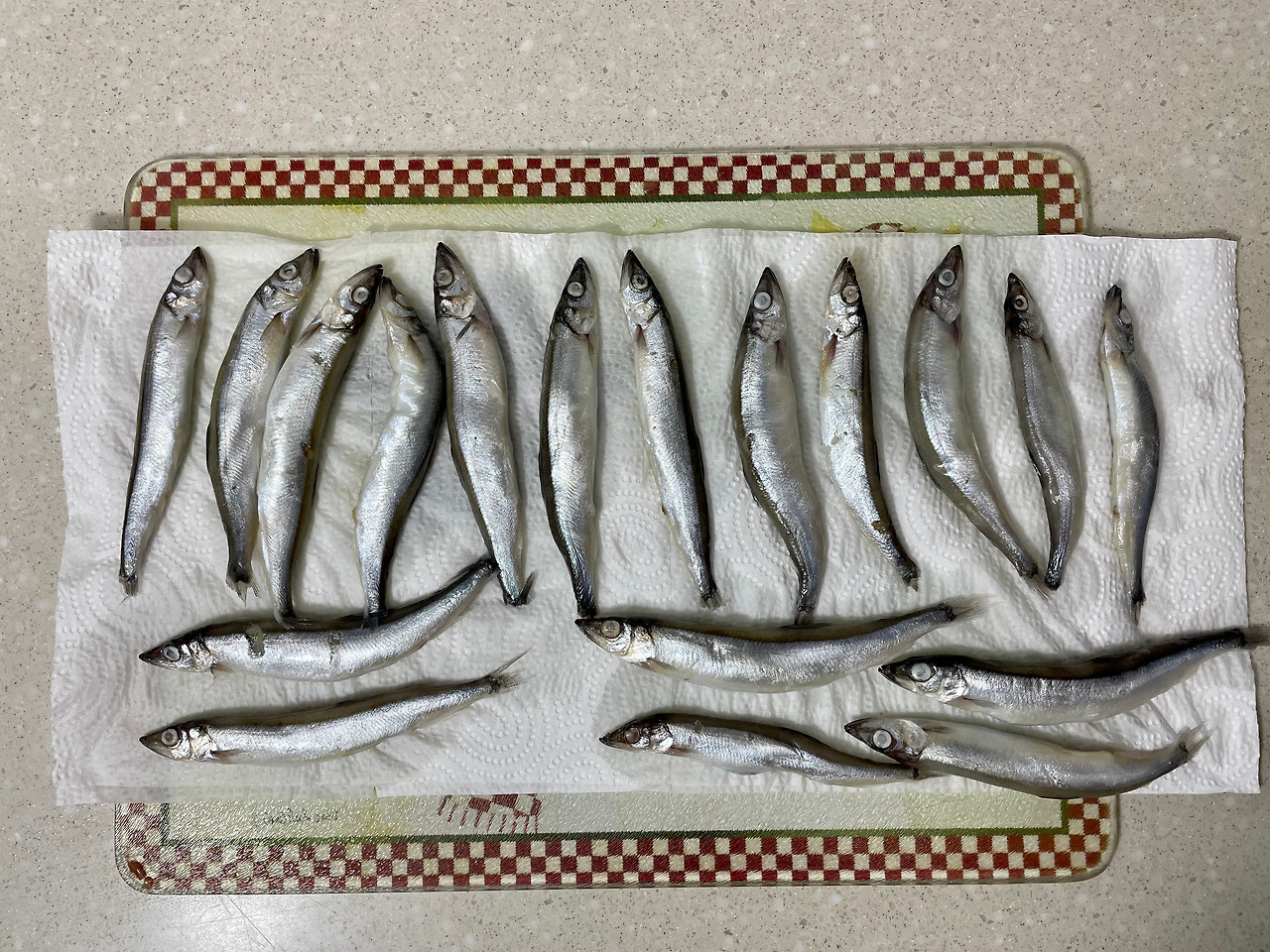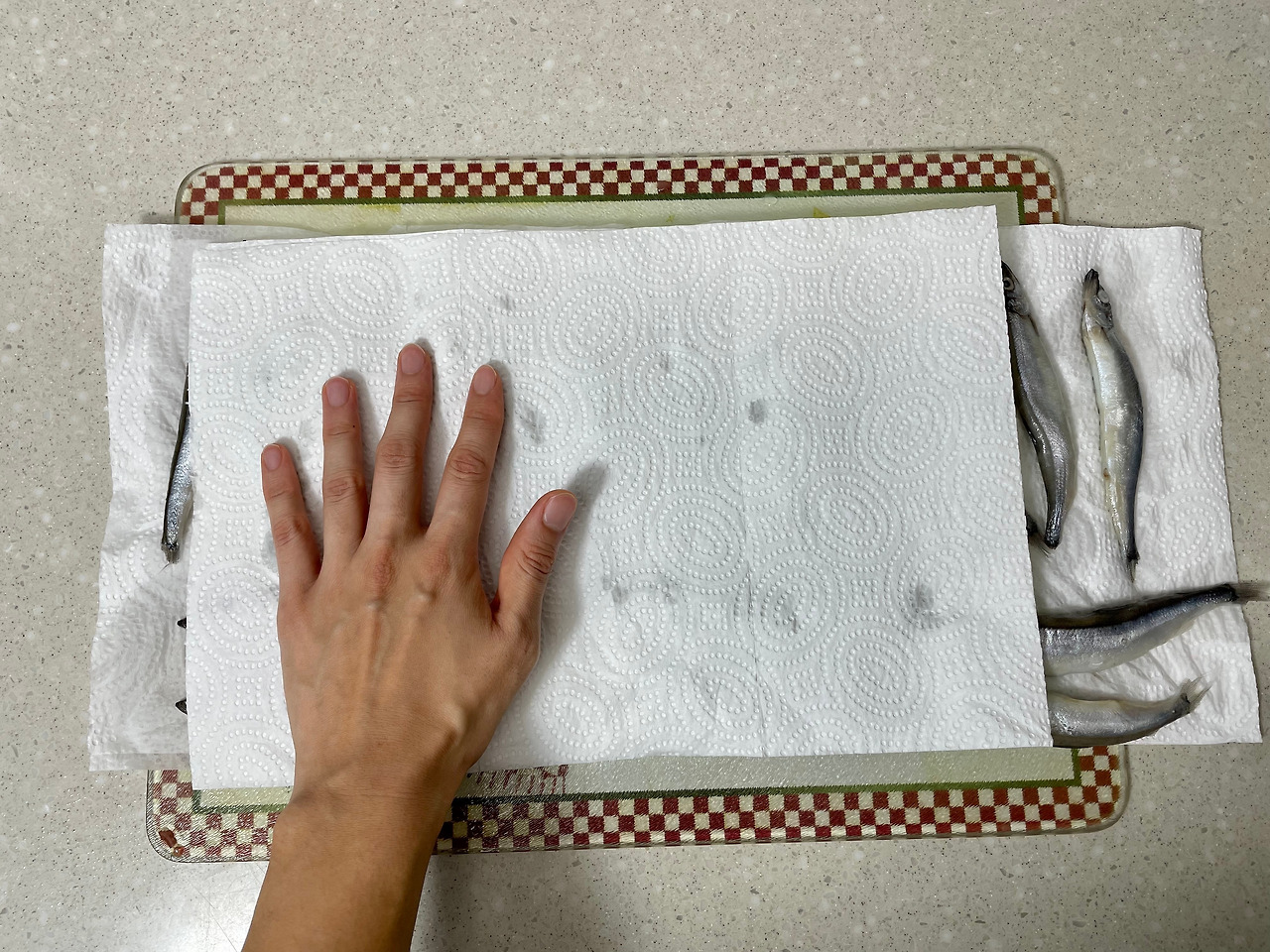 2. 키친타올에 열빙어를 올리고 다른 키친타올을 덮어 물기를 제거해줍니다. 이때, 조심스럽게 만져주세요. 꾹 누르면 알이 터질 수 있거든요.