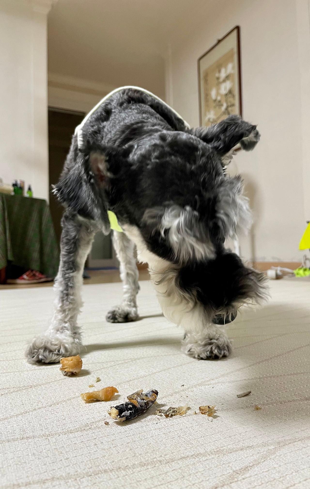 슈렉이는 췌장염을 두 번이나 앓았던 강아지라 음식을 조심해야 합니다. 지금은 시판 사료, 시판 간식은 일절 급여하지 않고, 대신 집에서 엄마가 만들어주는 밥을 먹어요. 닭가슴살, 오리가슴살, 대구살, 소고기 홍두깨살, 북어채, 두부 등을 주재료로 각종 야채와 쌀로 만든 죽을 먹습니다. 췌장염 재발 가능성 때문에 시판 간식 대신 과일, 요거트, 야채를 간식으로 먹고요. 그리고 가끔 특별간식으로 열빙어 져키를 만들어줘요.