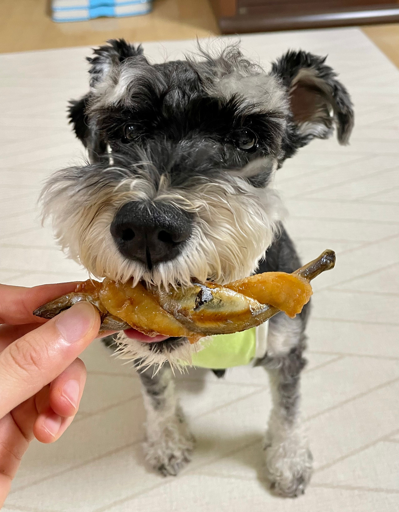 열빙어는 뼈째 먹는 생선으로 단백질뿐 아니라 칼슘과 각종 무기질이 풍부하여 뼈 건강과 발육에 도움이 됩니다. 열량과 지방함량이 낮기 때문에 슈렉이처럼 췌장염 환자가 먹기에도 적합하고요. 그렇지만 반려견이 좋아한다고 너무 많이 주시면 사료 거부, 과체중 등의 원인이 될 수 있으므로 간식은 하루 필요 열량의 10~20% 이내로 급여하는 것이 좋습니다.
