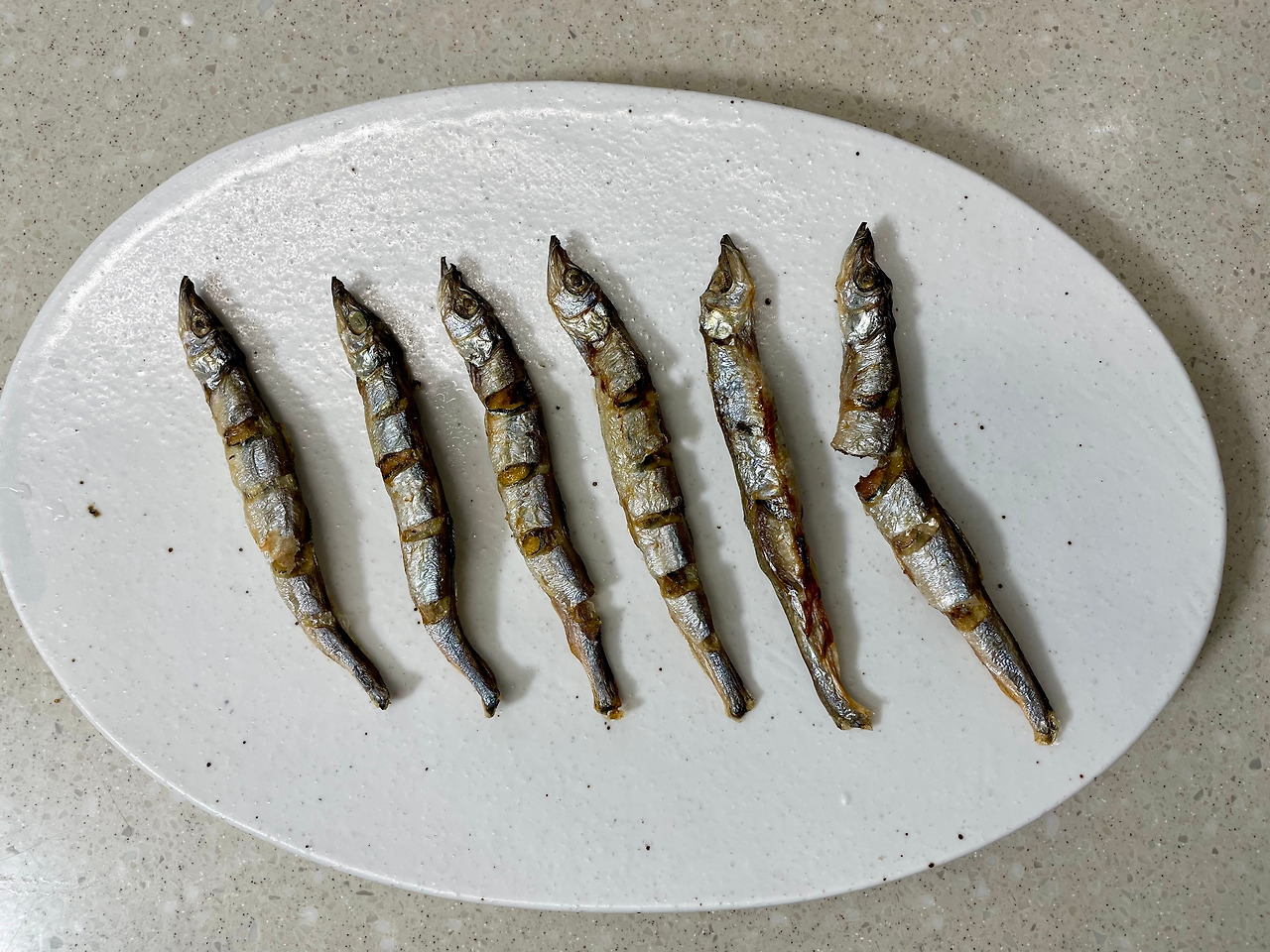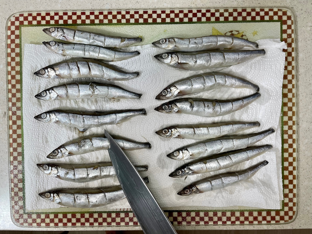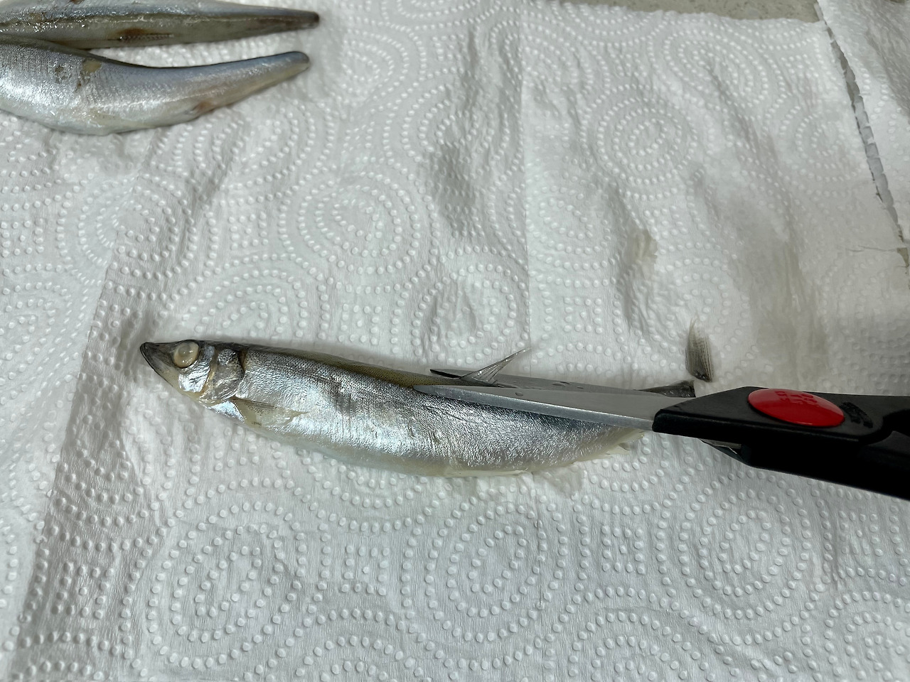 3. 열빙어의 꼬리와 지느러미를 제거해줍니다. 꼬리, 등 지느러미, 가슴 지느러미 2개, 배 지느러미 2개, 총 6개를 제거할 수 있어요. 혹시라도 뾰족하게 건조되어 강아지의 목을 찌를까 봐 제거하는 것이지만, 대형견이거나 강아지가 건강하다면 이 과정은 생략해도 됩니다. 그리고 속까지 잘 익을 수 있도록 칼집을 내줘요. 이 과정도 준비하는 양이 많아 번거롭다면 생략 가능합니다.