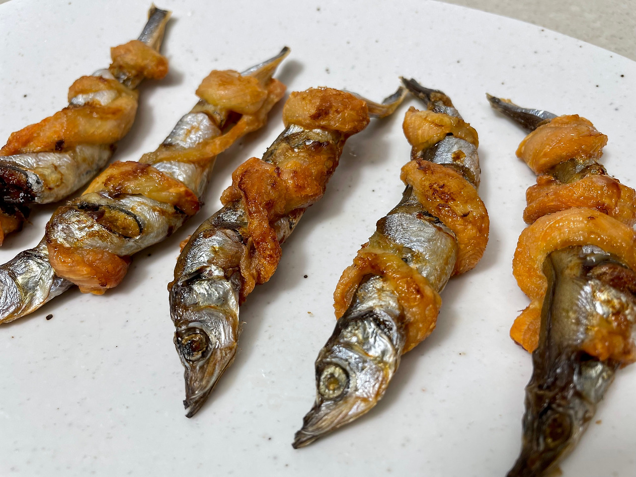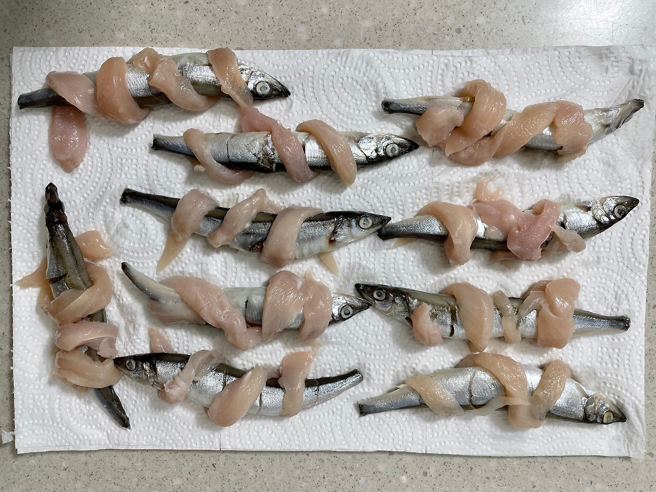 5. 닭안심을 열빙어에 돌돌돌 감아줍니다. 혹시 알이 터진 부분이 있다면 닭안심으로 잘 가리며 말아주시면 됩니다. 닭안심을 감싸다가 끊어진다면 당황하지 말고 이어서 말아주세요. 건조하는 과정에서 열빙어에 잘 붙으니까요.