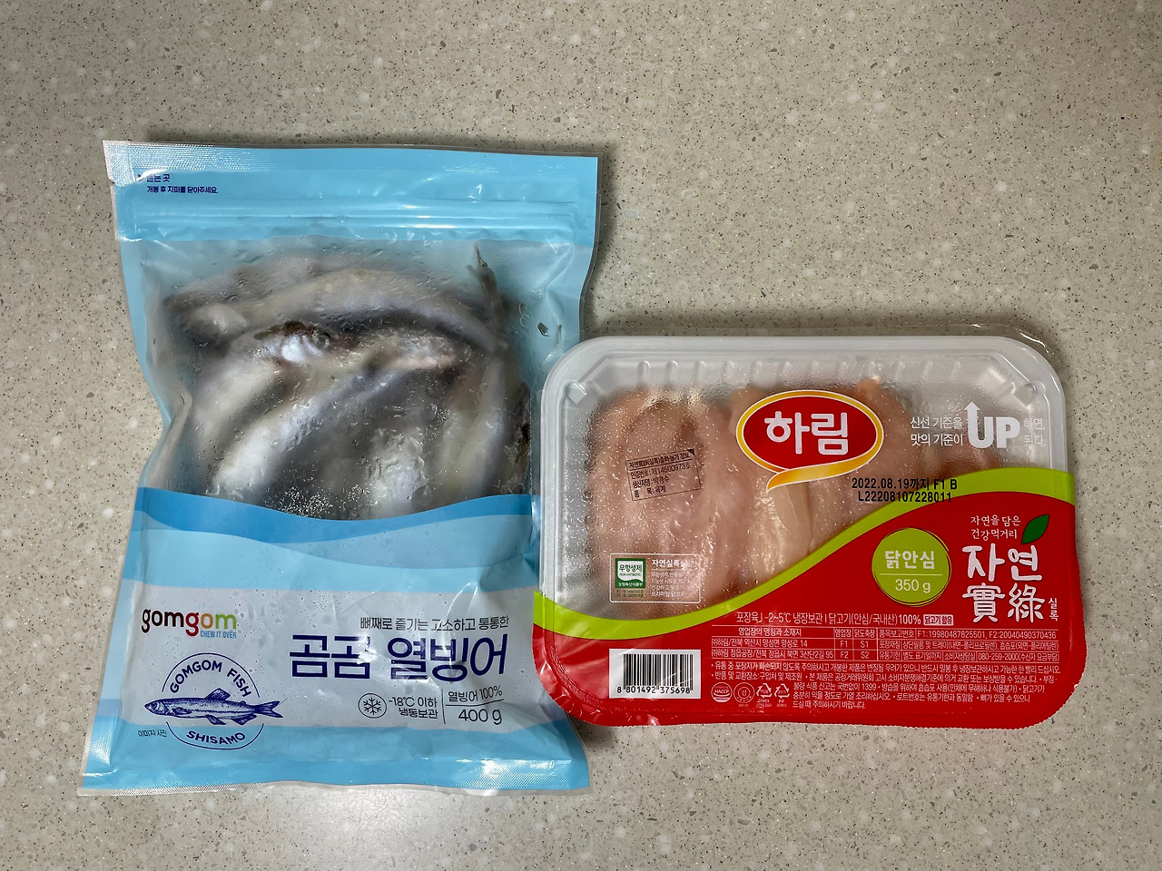 재료: 냉동 열빙어(시사모) 1봉지, 닭안심 1팩