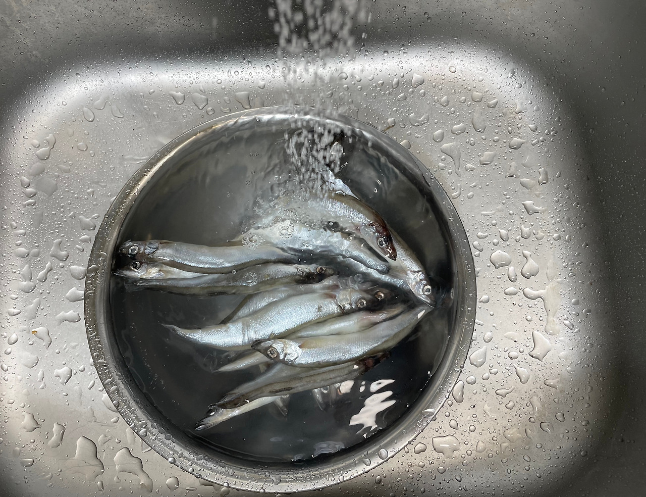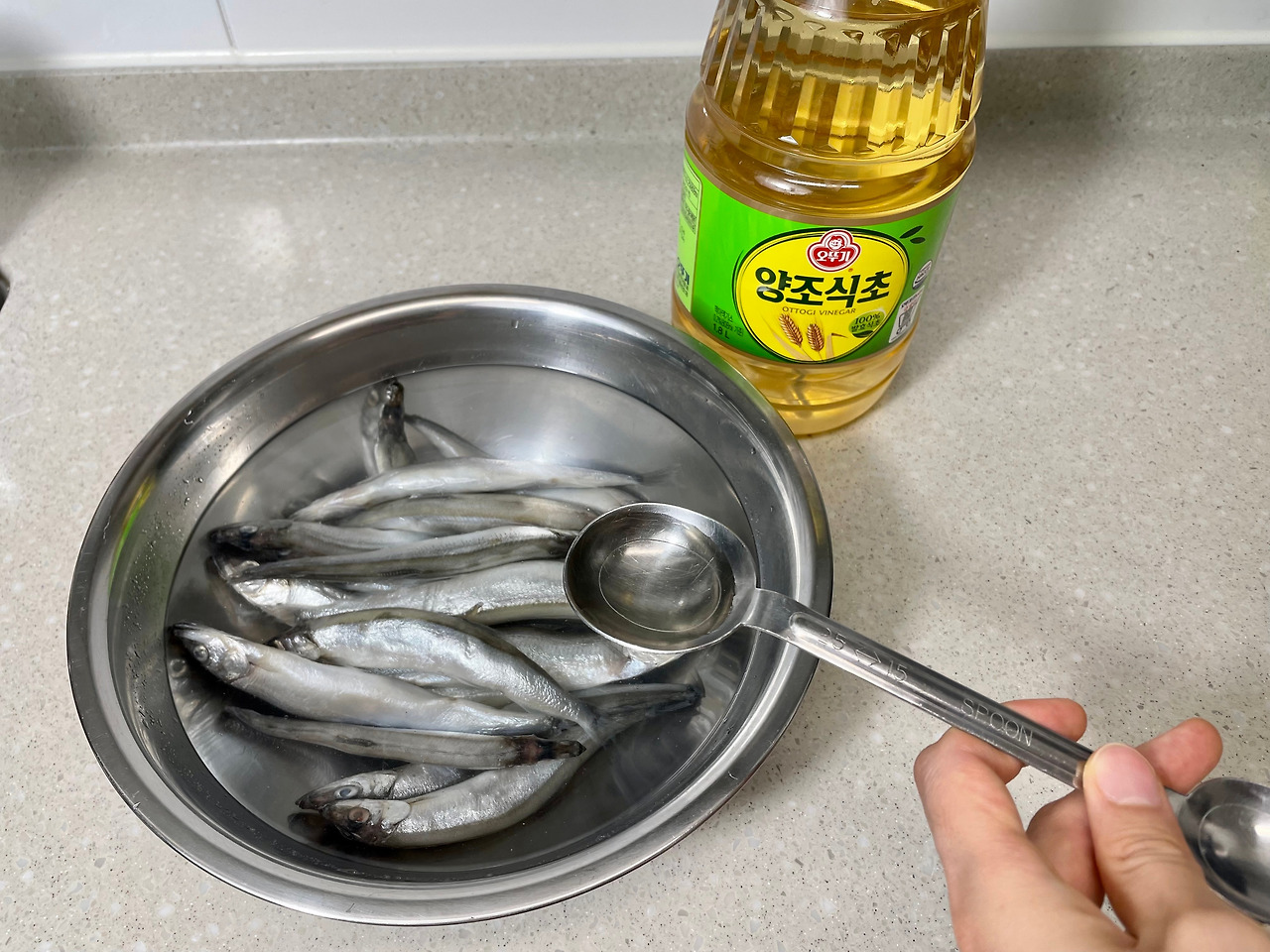 1. 냉동 열빙어는 찬물에 담가 해동합니다. 염분, 산화방지제 등을 제거하기 위해서 물을 20~30분마다 갈아주면서 2~3시간 담가요. 마지막 물에는 식초를 한 스푼 넣어 남은 불순물과 비린내를 제거합니다.