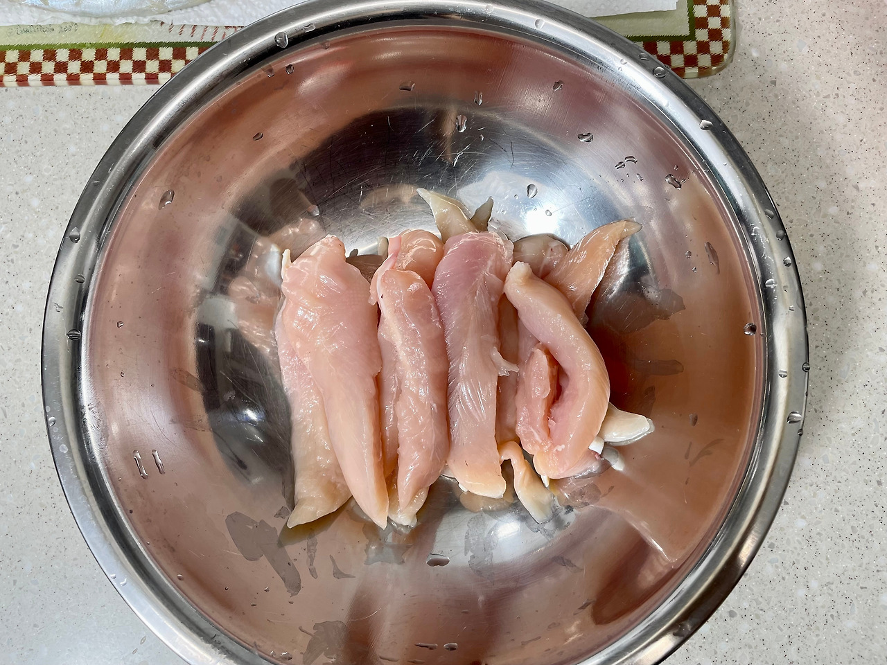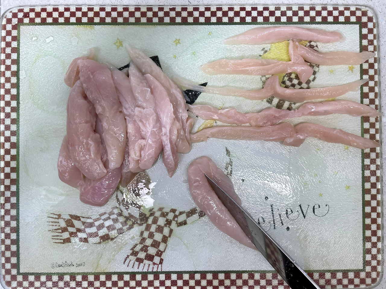 4. 닭안심살도 식초를 풀은 물에 헹구어 불순물이 빠지도록 하고, 흰 심이나 지방이 눈에 보인다면 제거해줍니다. 닭안심을 크기에 따라서 길게 2~3등분 칼집을 내는데, 끝 부분을 1cm 남깁니다. 그러면 열빙어에 감싸기 좋게 길이가 긴 닭안심을 만들 수 있어요.