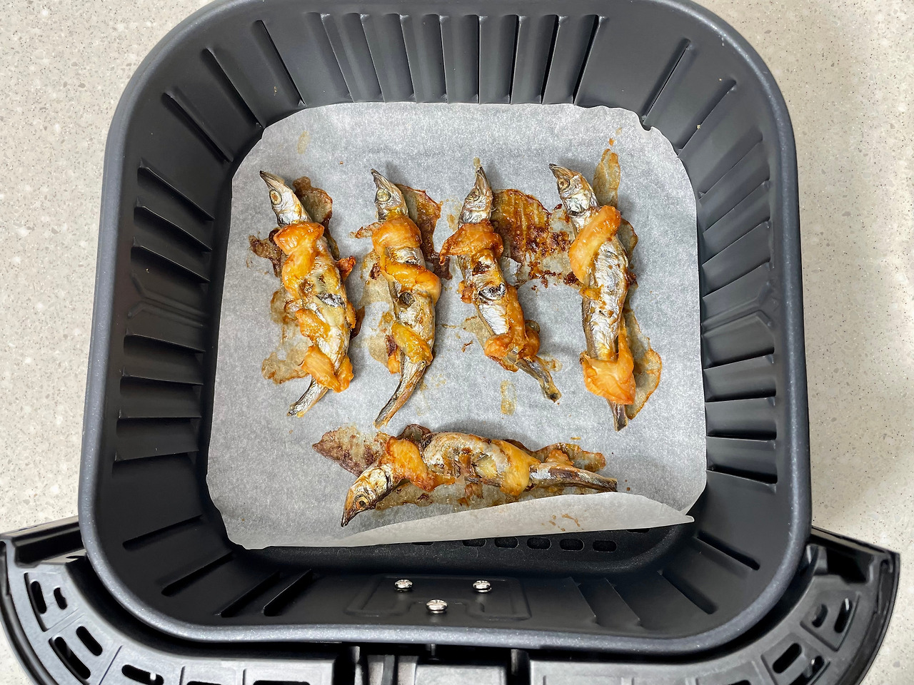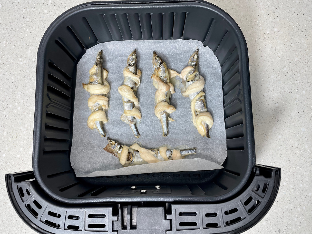 6. 종이호일을 깐 에어후라이어에 적당한 간격으로 놓아두고 140도에서 20분으로 설정합니다. 종이호일을 깔지 않으면 눌어붙어서 설거지도 힘들고 열빙어가 부서질 수도 있으니 깔아주시는 것이 좋아요. 20분 후에는 뒤집어서 한 번 더 20분을 돌려줍니다. {160도에서 12분씩 2번, 앞,뒤로 구우면 조금 더 색이 진하고 바삭한 식감이 됩니다.}