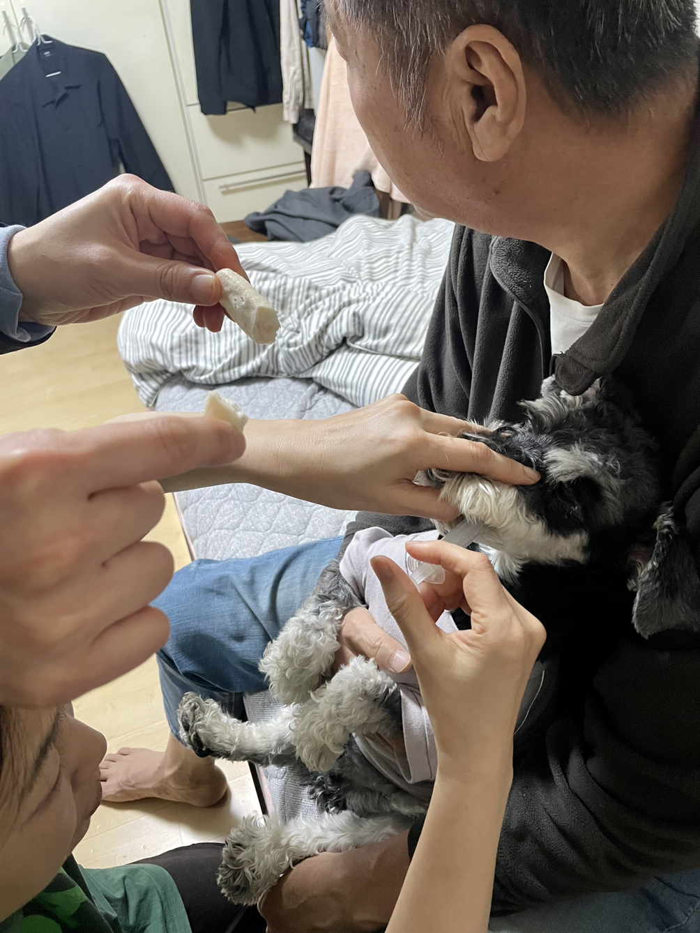 줄기세포치료는 옆으로 누인 슈렉이 뒷다리에 주사를 놓는 방식으로 진행되었다. 농도가 높은 중간엽 줄기세포라고 했다. 주사할 때 보호자도 들어갈 수 있게 해 주셔서 신음소리를 내는 슈렉이 이마를 쓰다듬어주며 안정시킬 수 있었다. 그나마 다행이었다.