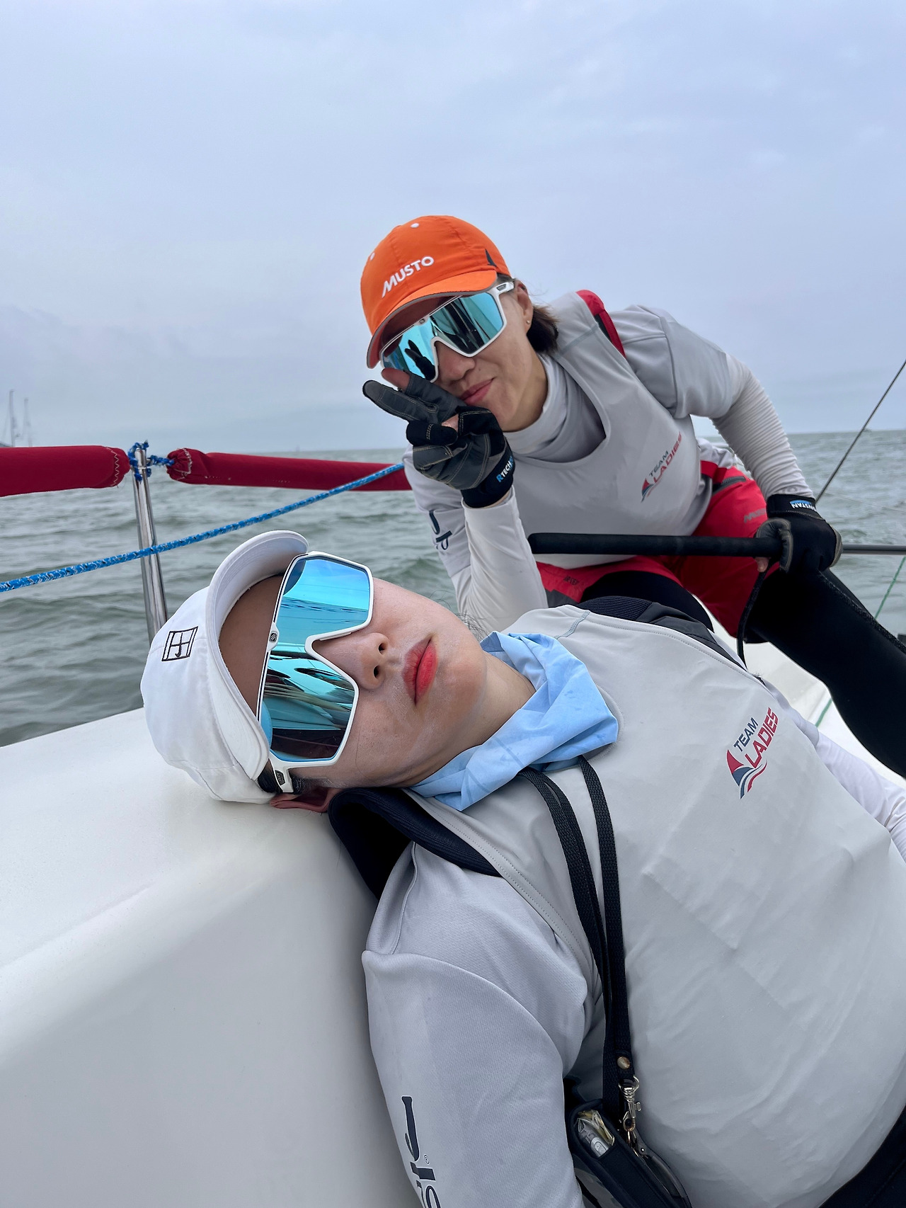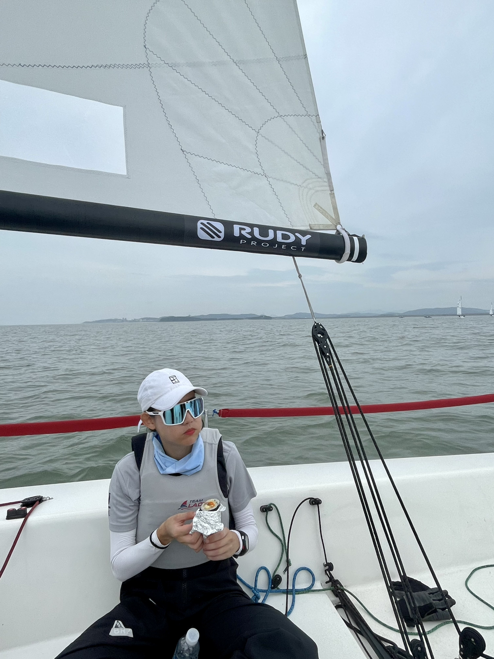 한 방을 쓴 나도 함께 잠을 설쳤다. 수면이 충분하지 못하면 컨디션이 떨어지는 나는 ‘망했다‘ 싶었다. 컨디션 관리를 제대로 못해서 팀에 피해를 주면 안 되는데 어쩌지. 부족한 에너지를 열량으로라도 채워야 한다는 생각에 눈을 뜨자마자 새벽부터 냉장고를 열어 자두를 한 알 입에 넣었다. 드립커피를 내려 카페인으로 정신도 깨웠다. 요트를 타자마자는 초콜릿바를 까서 입에 욱여넣었고 얼마 후 경기 운영정에서 아침으로 나눠준 샌드위치를 뚝딱 해치웠다. 열심히 먹을 것을 찾아 넣고 있는 나를 다른 멤버들은 신기하게 쳐다봤지만, 내 몸을 챙기고 내 컨디션을 최상으로 올리는 게 팀을 위한 길이기에 아랑곳하지 않았다. 더구나 나는 트리머로서 힘을 쓰는 포지션이니까. 점심으로 나눠준 김밥도 한 줄 뚝딱.