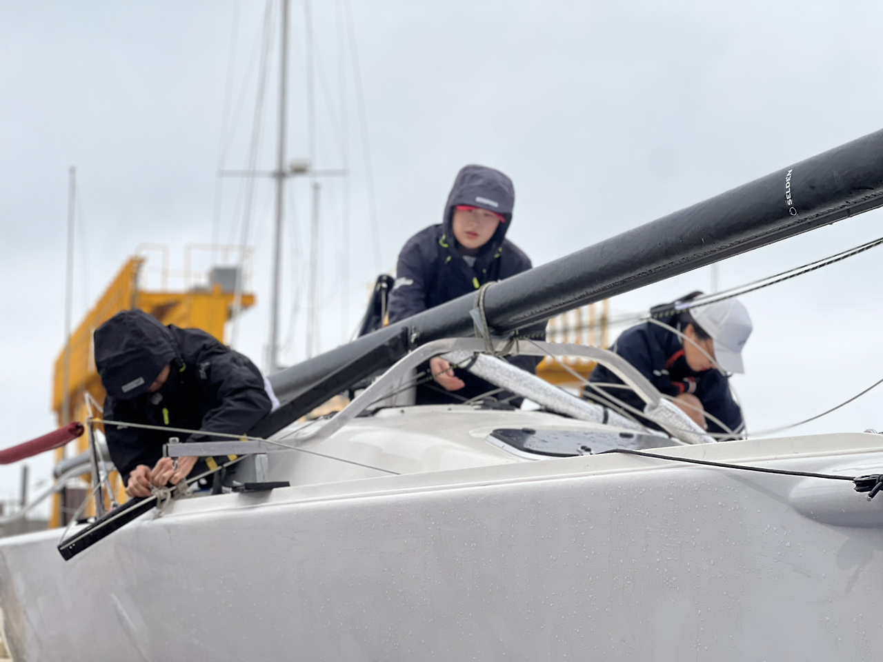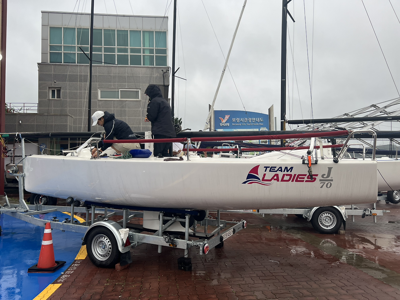 비가 잦아든 틈을 타 밖으로 나와 9m에 달하는 마스트를 들어올리자 바람에 휘청인다. 이번 대회의 요트 J70은 2012년 처음 등장한 최신 요트 모델로 헐은 유리섬유로, 마스트는 카본으로 만들어져 있다. 카본 마스트의 장점은 가벼운 무게인데, 크레인 없이 사람의 힘으로 들 수 있을 정도다.