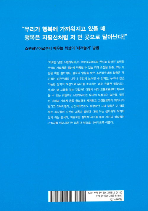 남편의 내년 목표가 쇼펜하우어 읽기다. 『괴로운 날엔 쇼펜하우어』는 그런 남편에게 선물하려고 데려왔다. 자음과모음의 '필로테라피' 시리즈로, 원제는 'Lacher prise avec Schopenhauer'이며 2011년작이다. '필로테라피' 시리즈는 "사색하고 숙고하는 ‘학문’을 넘어서 우리 삶에 철학을 적용해 행동으로 촉발하기 위해 기획"됐다고 한다.