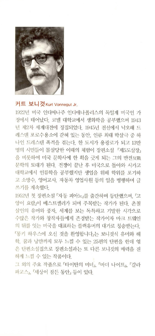 오신 것을 환영합니다』의 원제는 ' Welcome to the monkey House'로 2010년작이다. 보니것이 장편소설 창작 전 <코스모폴리탄> <플레이보이> 등 대중 잡지에 팔았던 25편의 단편이 수록되어 있다고 한다.