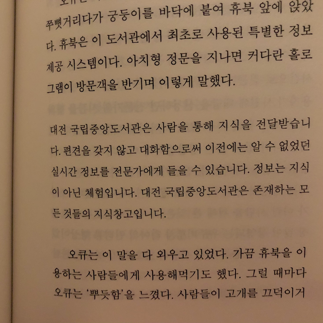 <오-아이>를 읽으며 나는 논문에서 소설을 쓴 건지도 모르겠다는 생각마저 들었다. 어찌 보면 천선란이 그리고 있는 도서관의 모습은 내가 논문에서 도출한 결론의 양상과 비슷한 맥락이기 떄문이다.