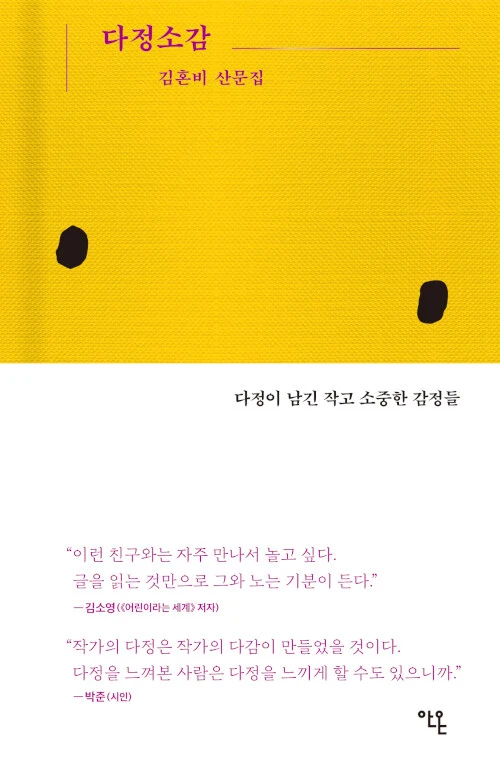 이 책의 제목은 ‘다정다감’을 장난스레 비튼 말이자 다정들에서 얻은 작고 소중한 감정의 총합을 뜻해요. 저자는 말해요. “주저앉고 싶은 순간마다 ‘내가 무능력했지 무기력하기까지 할까 봐!’라고 덮어놓고 큰소리칠 수 있었던 것도 내 안에 새겨진 다정들이 내가 나를 사랑하는 것을 쉽게 포기하지 않게 붙들어주었기 때문이다. 똑같은 패턴을 반복해서 얻게 되는 건 근육만이 아니었다. 다정한 패턴은 마음의 악력도 만든다.”