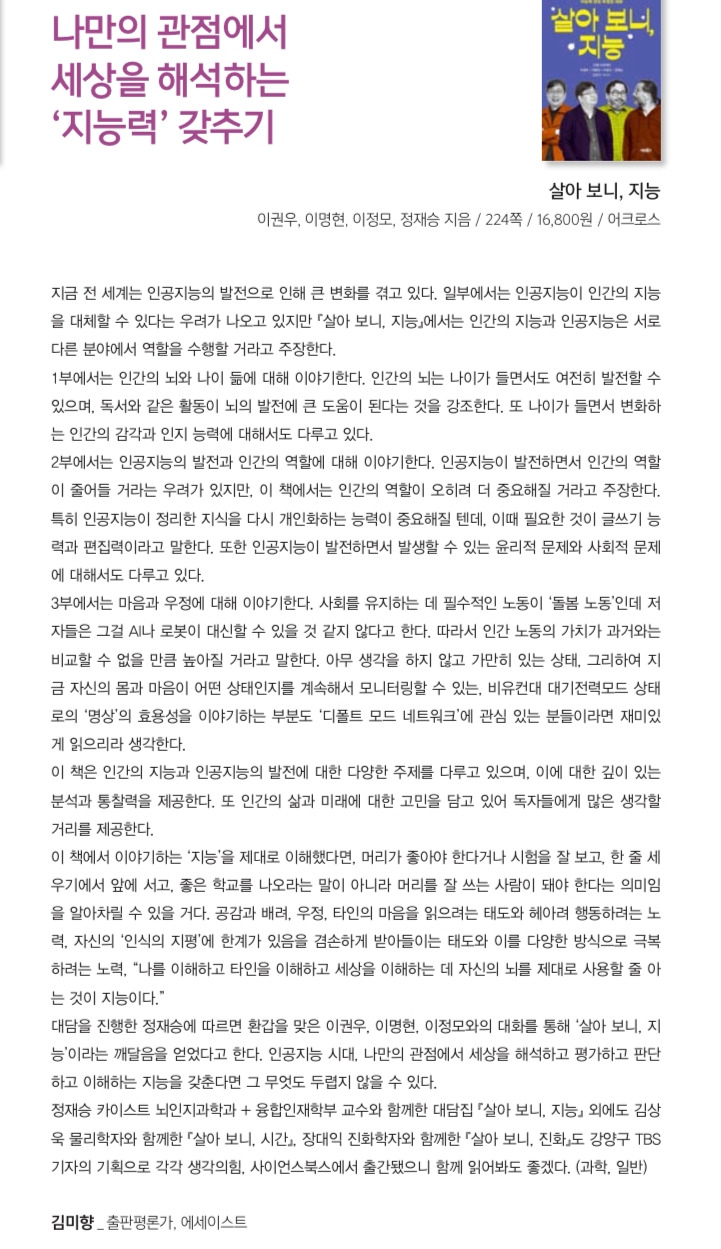 대담을 진행한 정재승에 따르면 환갑을 맞은 이권우, 이명현, 이정모와의 대화를 통해 ‘살아 보니, 지능’이라는 깨달음을 얻었다고 한다. 인공지능 시대, 나만의 관점에서 세상을 해석하고 평가하고 판단하고 이해하는 지능을 갖춘다면 그 무엇도 두렵지 않을 수 있다.