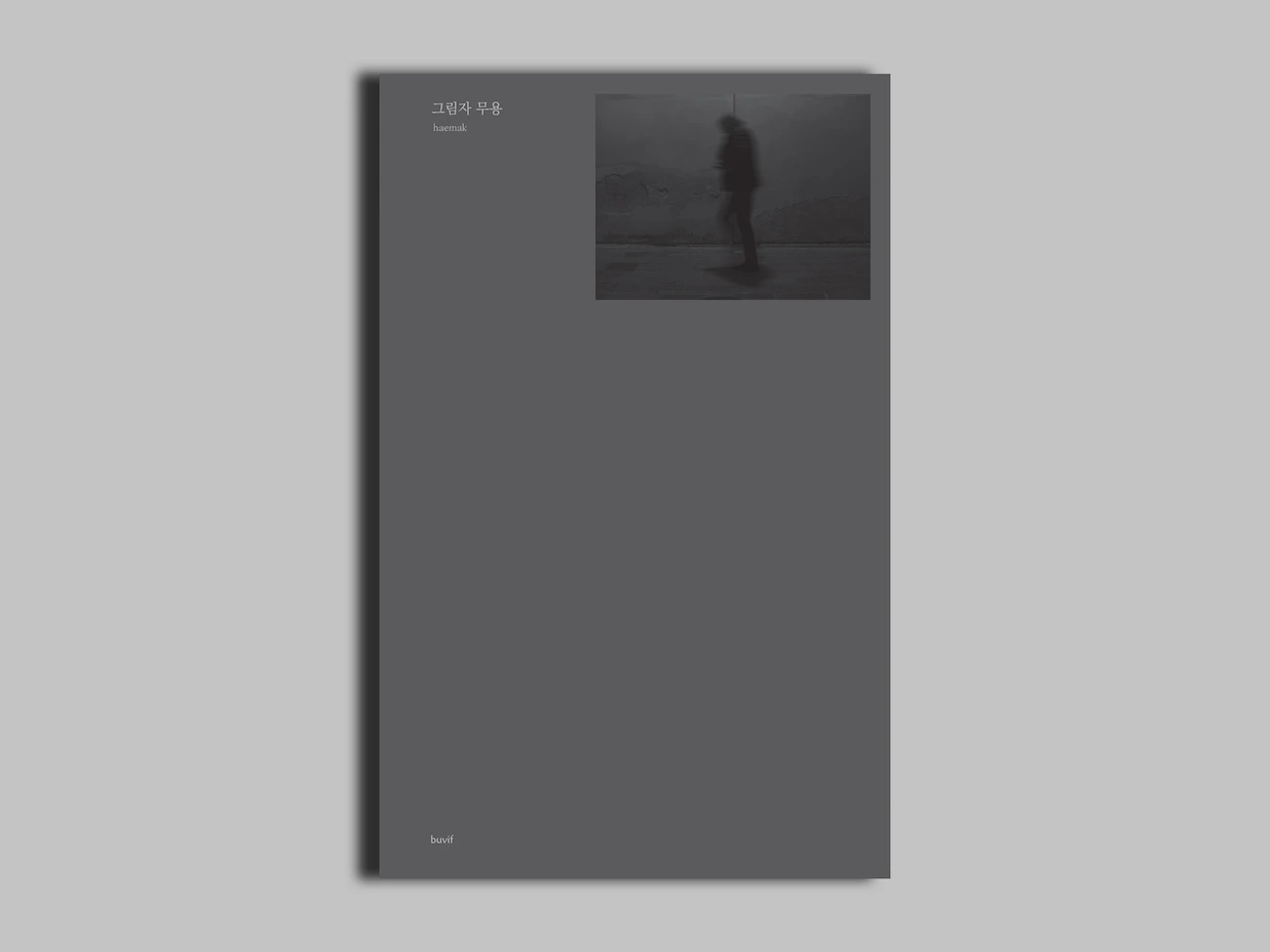 그림자를 연상시키는 진회색의 표지, 검은색의 면지와 헤드밴드, 빛을 연상시키는 백박 후가공과 흰색실의 사철제본, 표지 모서리 부분 사각모양의 형압을 사용해 부착한 ‘그림자 무용’의 사진이 스러지는 듯하면서도 힘 있는 이 책의 사진들과 잘 어울린다.