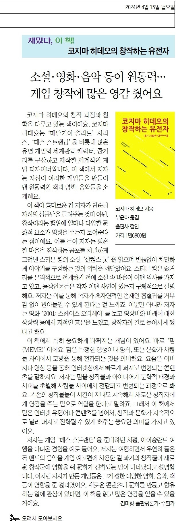 창작물 뒤에 숨겨진 이야기들은 창작자의 생각을 이해하는 데 도움을 줘요. 게임, 영화, 문학, 예술 등 현대 문화와 예술에 관심이 많다면 코지마 히데오가 털어놓는 창작 과정의 비밀을 엿봄으로써 영감을 얻을 수 있을 거예요.