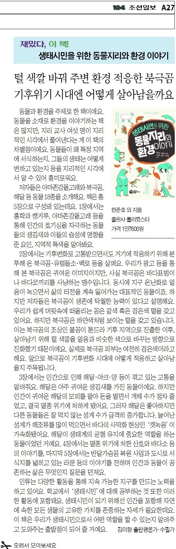 예를 들어 북극곰의 생존 전략, 아마존강돌고래의 강으로의 이동, 백로의 도시 생활 적응 등은 기존에 잘 몰랐던 새로운 사실을 알려주지요. 우리가 광고를 통해 보는 북극곰은 귀여운 이미지이지만 사실 북극권의 바다표범, 바다코끼리까지 사냥해서 먹는 맹수입니다. 지구 온난화로 얼음이 녹으면, 북극권의 해빙 면적이 감소하고, 북극곰은 바다표범을 사냥할 먹이 터전이 감소하게 돼 북극곰이 이후 어떻게 기후변화에 적응할지 귀추가 주목돼요.