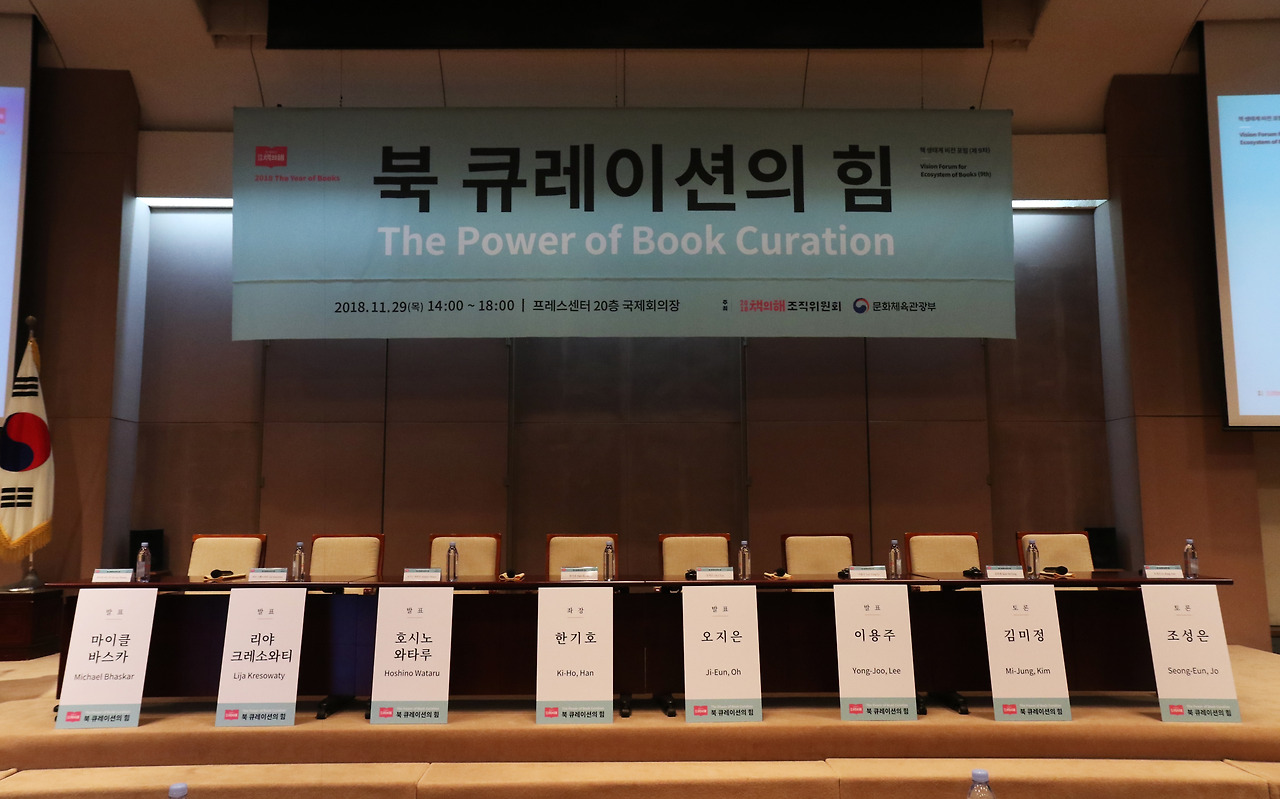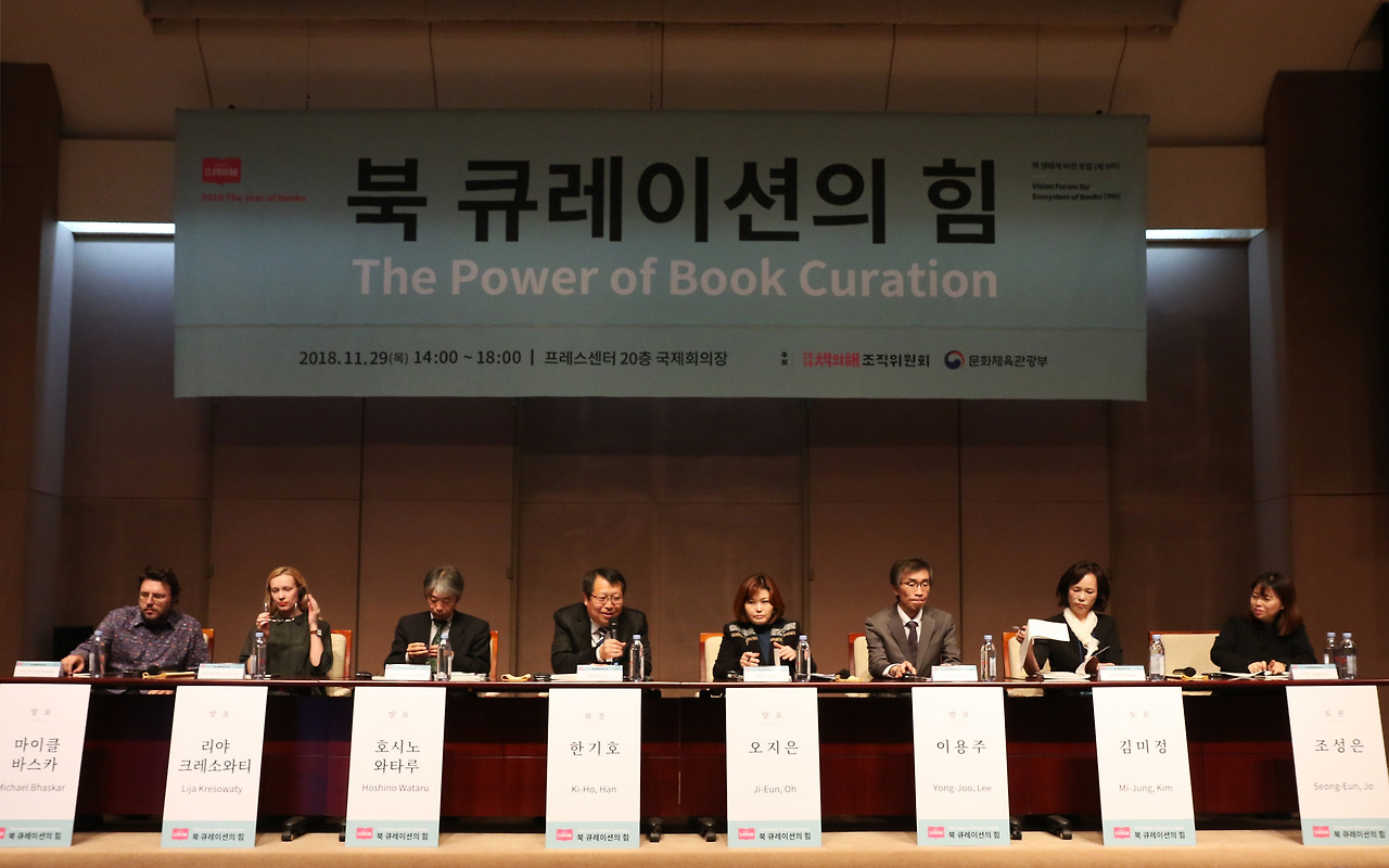 지난 11월 29일 오후 2시부터 6시까지 서울 프레스센터 20층 국제회의장에서 2018 책의 해 제9차 책 생태계비전 포럼이 열렸다. ‘북 큐레이션의 힘'을 주제로 진행된 이번 포럼에서는 한기호 한국출판마케팅연구소 소장이 좌장을 맡고 영국 카넬로 대표이자 『큐레이션』(예문아카이브)의 저자 마이클 바스카, 영국 북초이스 콘텐츠 디렉터 리야 크레소와티, 일본 문화통신사 편집장이자 전무이사인 호시노 와타루, 오지은 광진정보도서관 관장과 이용주 우분투북스 대표가 주제 발표에 나섰다. 이들의 주제 발표 이후에는 김미정 한국북큐레이터협회 회장과 조성은 레이어스랩 공동 대표의 토론이 이어졌다.