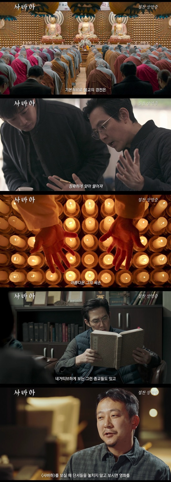녹야원 인도의 녹야원(鹿野苑, 사르나트)에서 따온 듯하다. 부처가 깨달음을 얻은 뒤 다섯 제자를 데리고 설법하고 경전을 만든 곳이다. <사바하>에서도 김제석은 경전을 쓰기 위해 동방교를 해체하고 녹야원에 잠적한다. 녹야원의 한자를 한글로 풀이하면 사슴동산인데, 영화에서 사슴동산은 사천왕을 모시며 영월을 중심으로 동서남북에 위치한 지역에 있는 신흥종교다. 아마 김제석은 81마리의 뱀을 모두 제거한 사천왕이 승천하여 부처가 됐을 때, 신도들이 너희들을 계속 섬겨줄 거라는 명분을 그들에게 제시하지 않았을까 싶다. 한편 감독은 사슴이 피해자의 느낌을 줌과 동시에 장수의 존재로 여겨지기 때문에 녹야원에 신비로움을 더해줄 것으로 판단했다. 영화에서 유지태 배우가 처음 등장할 때 사슴이 죽어 있는데, 이는 결국 김제석의 영생이 실패할 것임을 미리 관객에게 보여주는 것이라고 할 수 있다.